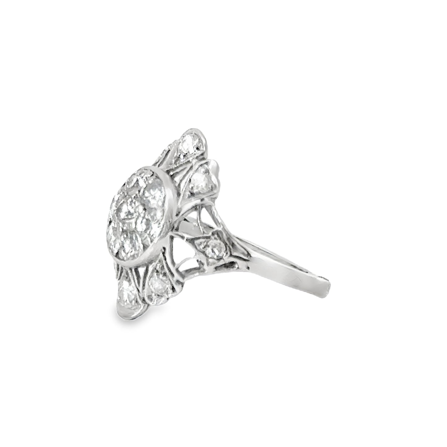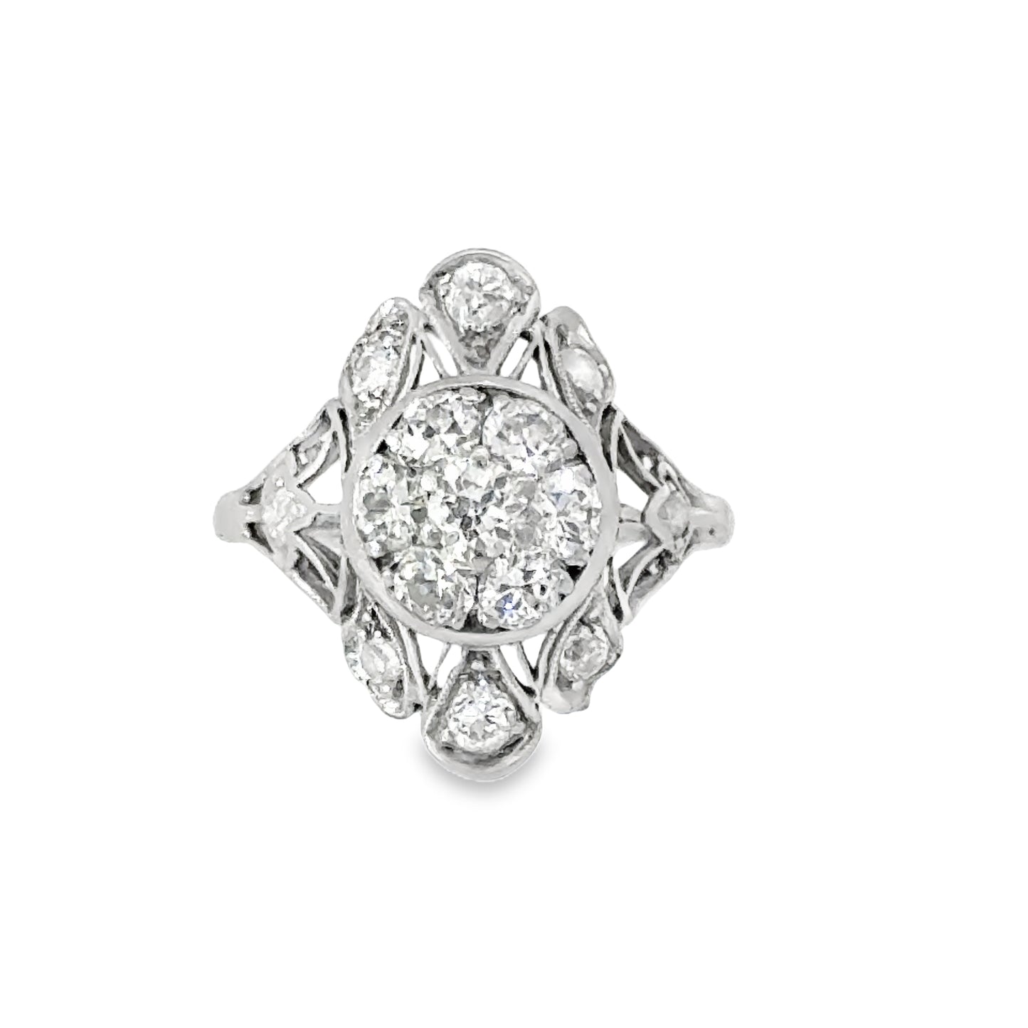 Antique platinum engagement ring with an intricate and classic design. The ring showcases a central cluster of round diamonds, forming a brilliant circular motif that exudes elegance and timeless beauty. Surrounding the central diamonds are additional accent diamonds, meticulously set in a delicate openwork design, enhancing the ring’s luxurious and vintage charm. The diamonds are held in place by fine prongs, creating a light and airy appearance while maximizing their brilliance.