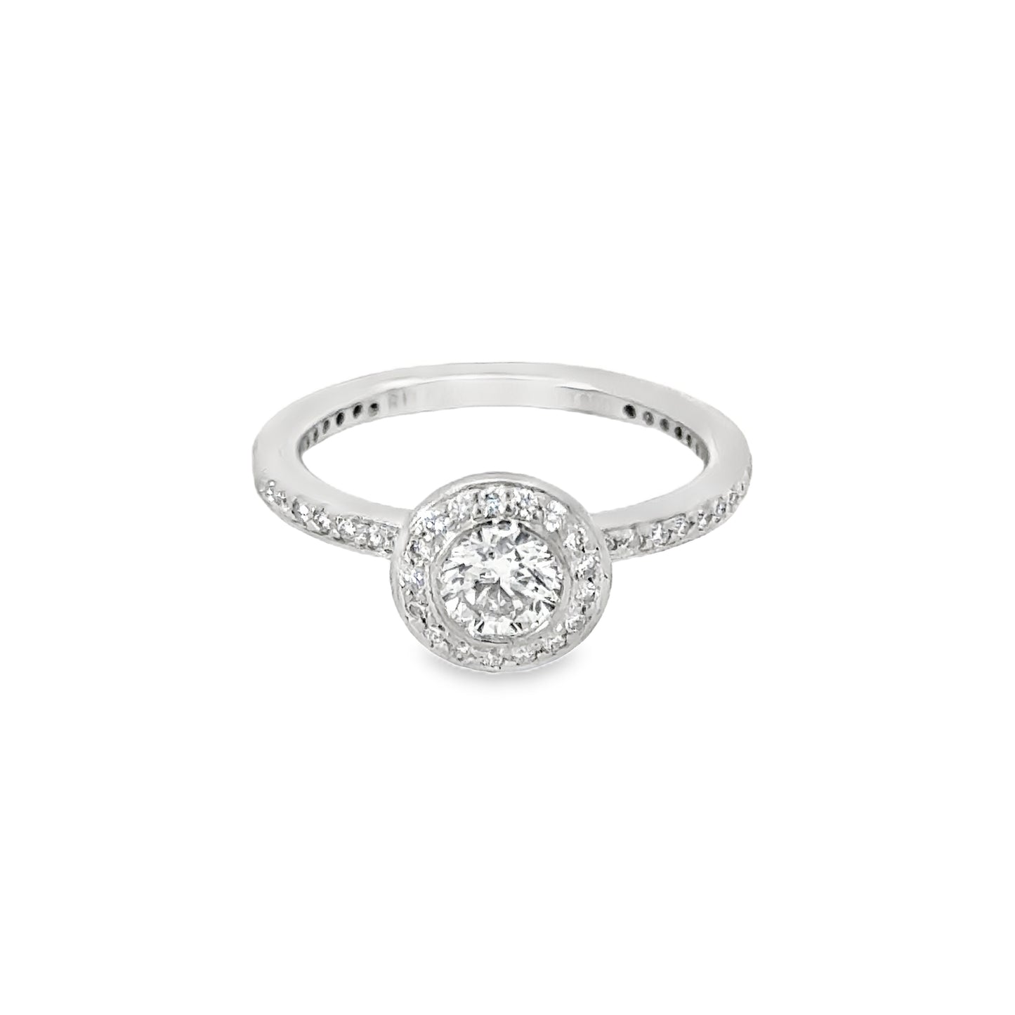 This ring is a stunning vintage platinum engagement ring that blends classic elegance with a modern twist. The centerpiece of the ring is a round brilliant-cut diamond, securely bezel-set, creating a smooth and polished look. Surrounding the center stone is a halo of smaller diamonds, each meticulously set to enhance the brilliance and size of the main diamond, giving it a radiant and timeless appeal. The shank of the ring is also adorned with a row of diamonds, adding to the sparkle and sophistication of the design. The overall effect is a harmonious blend of vintage charm and contemporary style, making it a perfect choice for someone who appreciates the beauty of the past with the sleekness of modern design. This ring would be an exquisite symbol of love and commitment, cherished for generations to come.