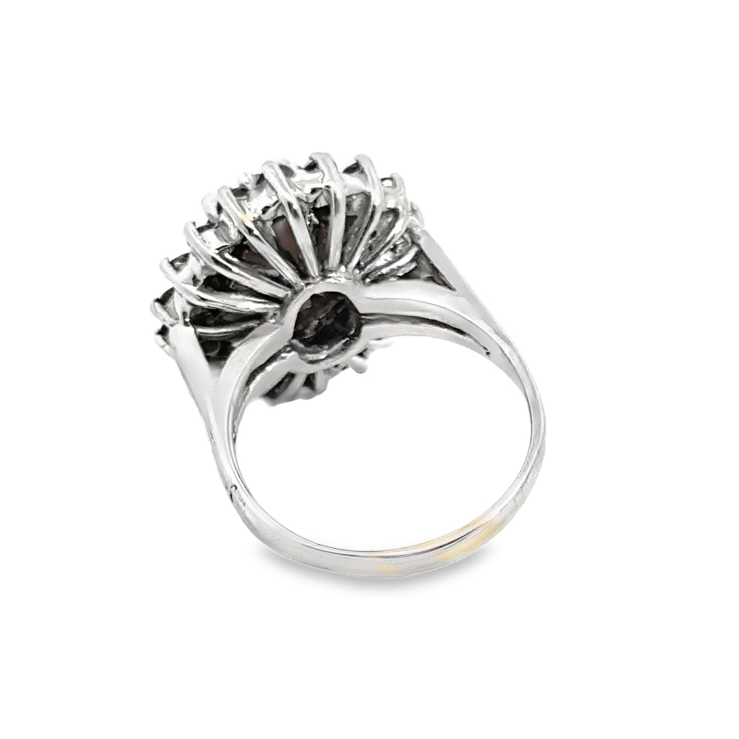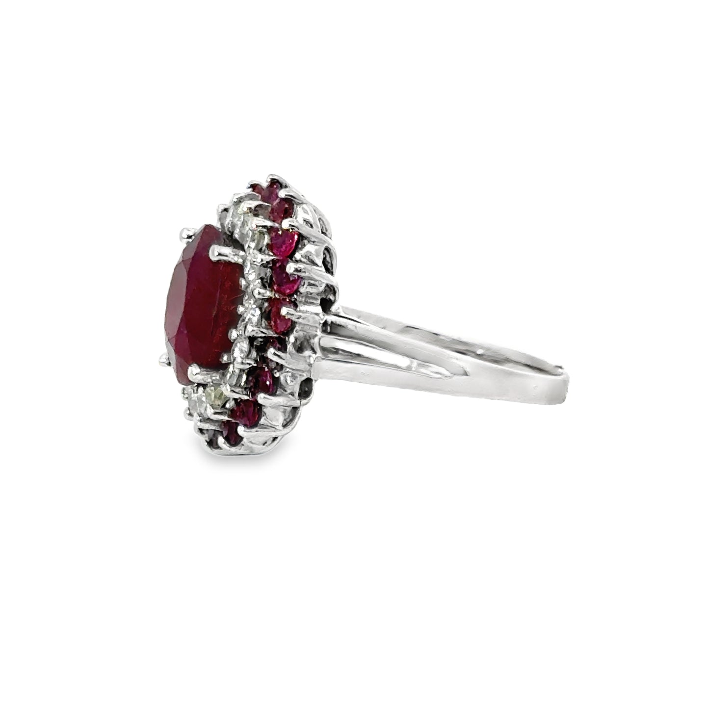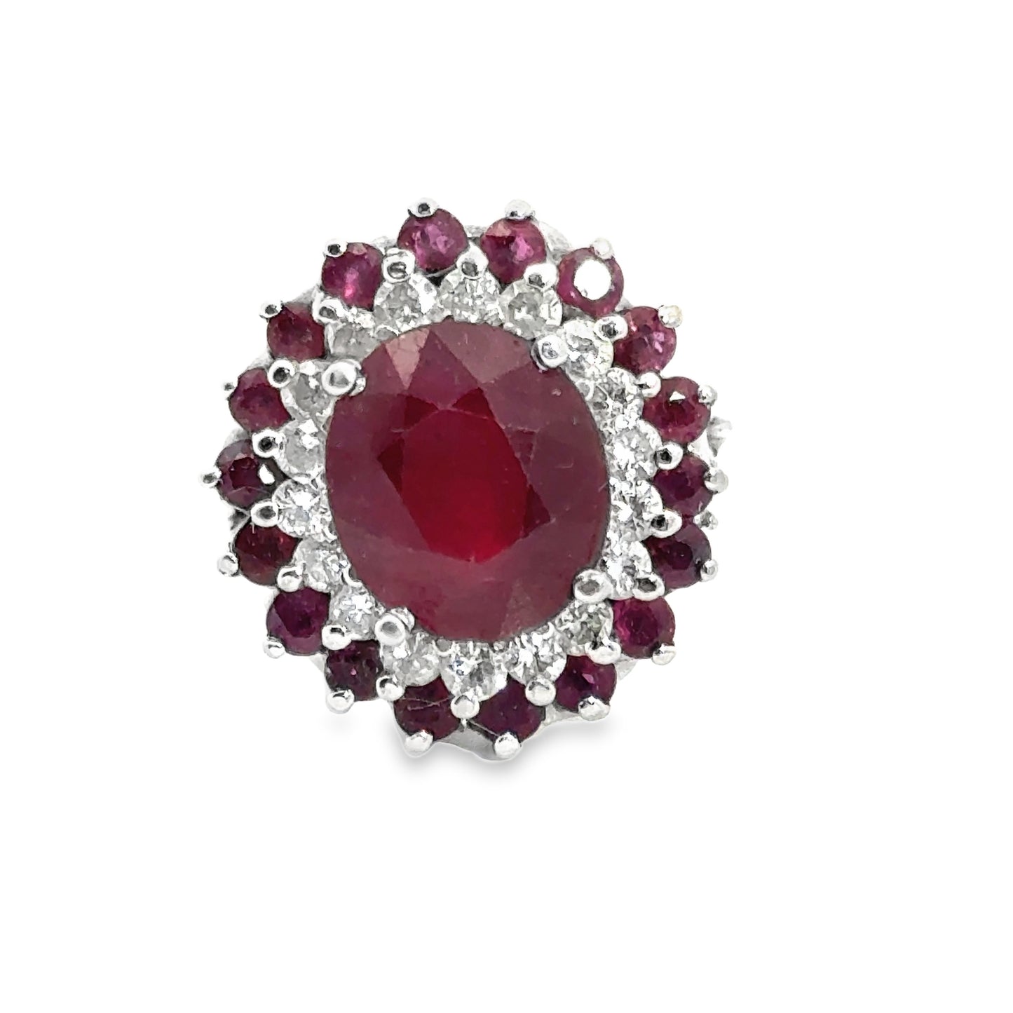 This stunning 14k white gold ring features a breathtaking starburst design, with a deep red oval-cut ruby at the center, surrounded by two layers of alternating rubies and diamonds. The rich red hue of the rubies contrasts beautifully with the cool brilliance of the diamonds, creating a striking visual impact. The diamonds, set in the white gold, enhance the sparkle, while the vivid rubies add warmth and vibrancy. The intricate gallery on the underside of the ring showcases excellent craftsmanship, adding to the elegance of this eye-catching piece. Perfect for those who appreciate bold, statement jewelry, this ring exudes both luxury and timeless beauty.