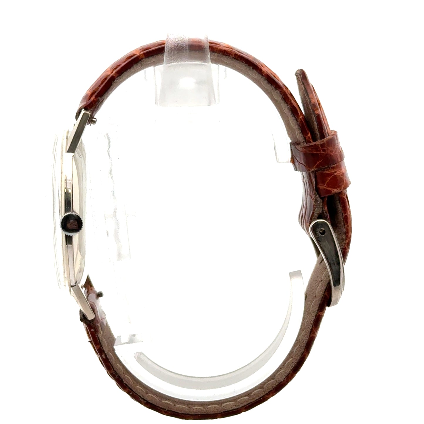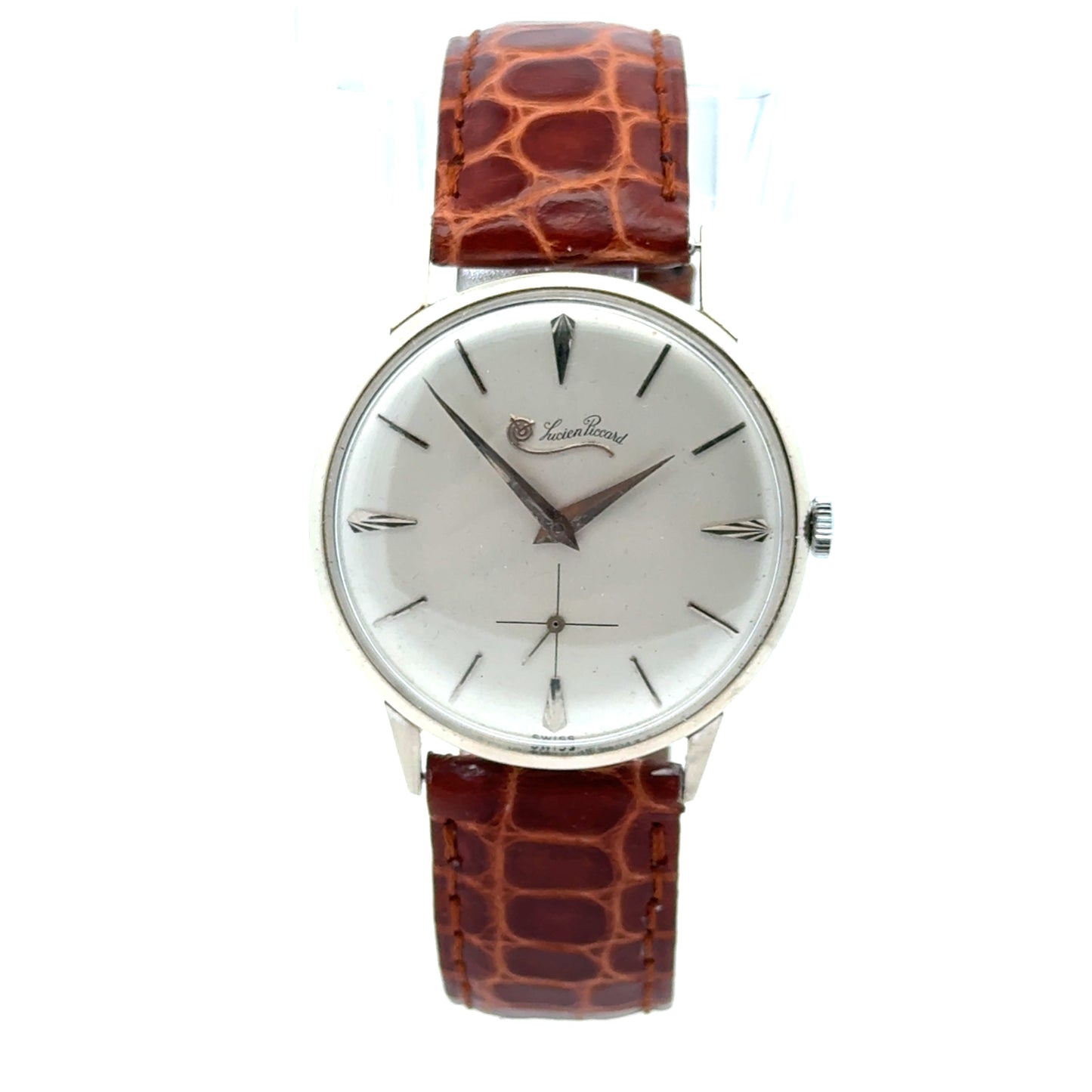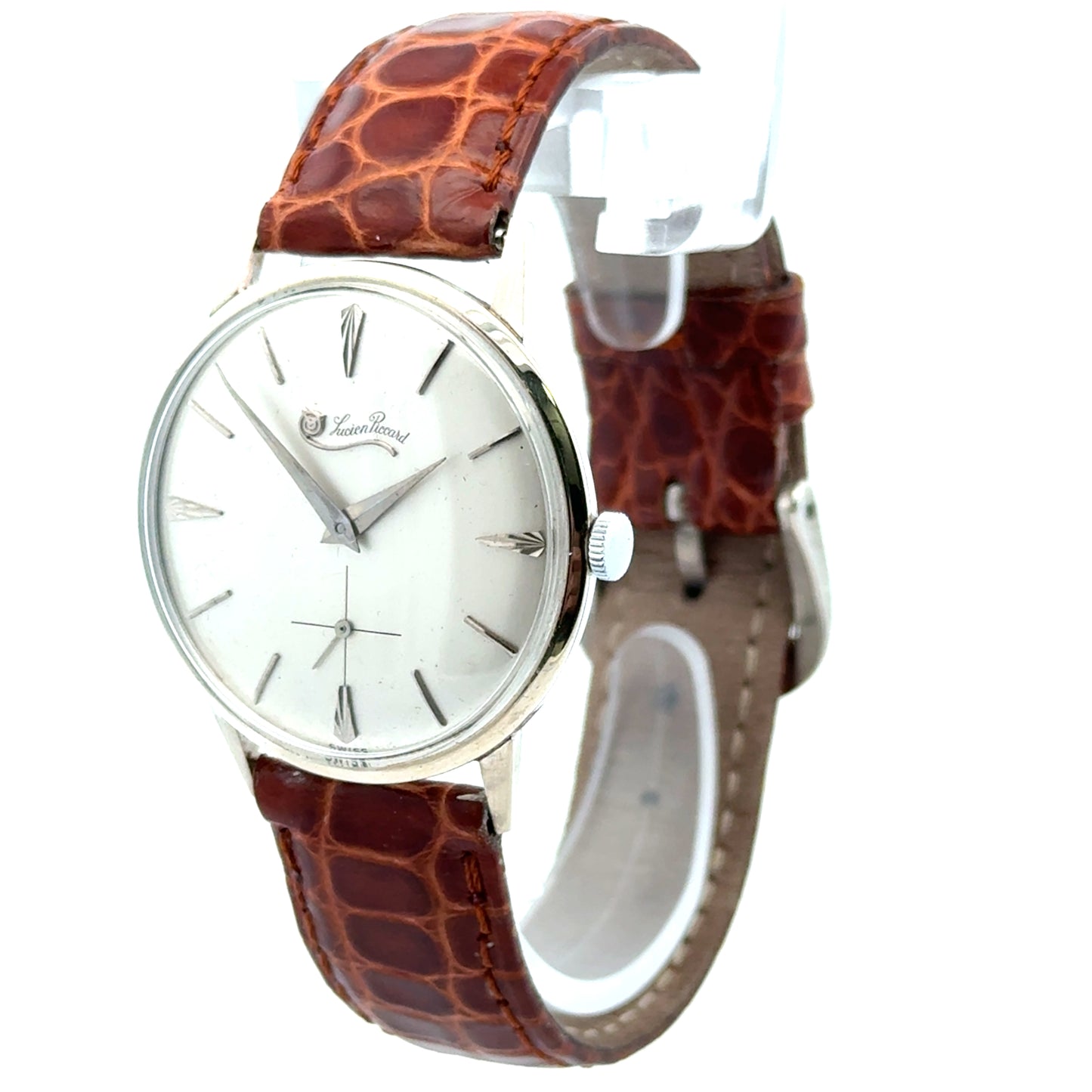 | Lucien Piccard, #167035, 14K White Gold, manual winding, vintage 1950’s, 33mm thin case, brown leather strap “Louisiana Alligator Handmade in Italy” |