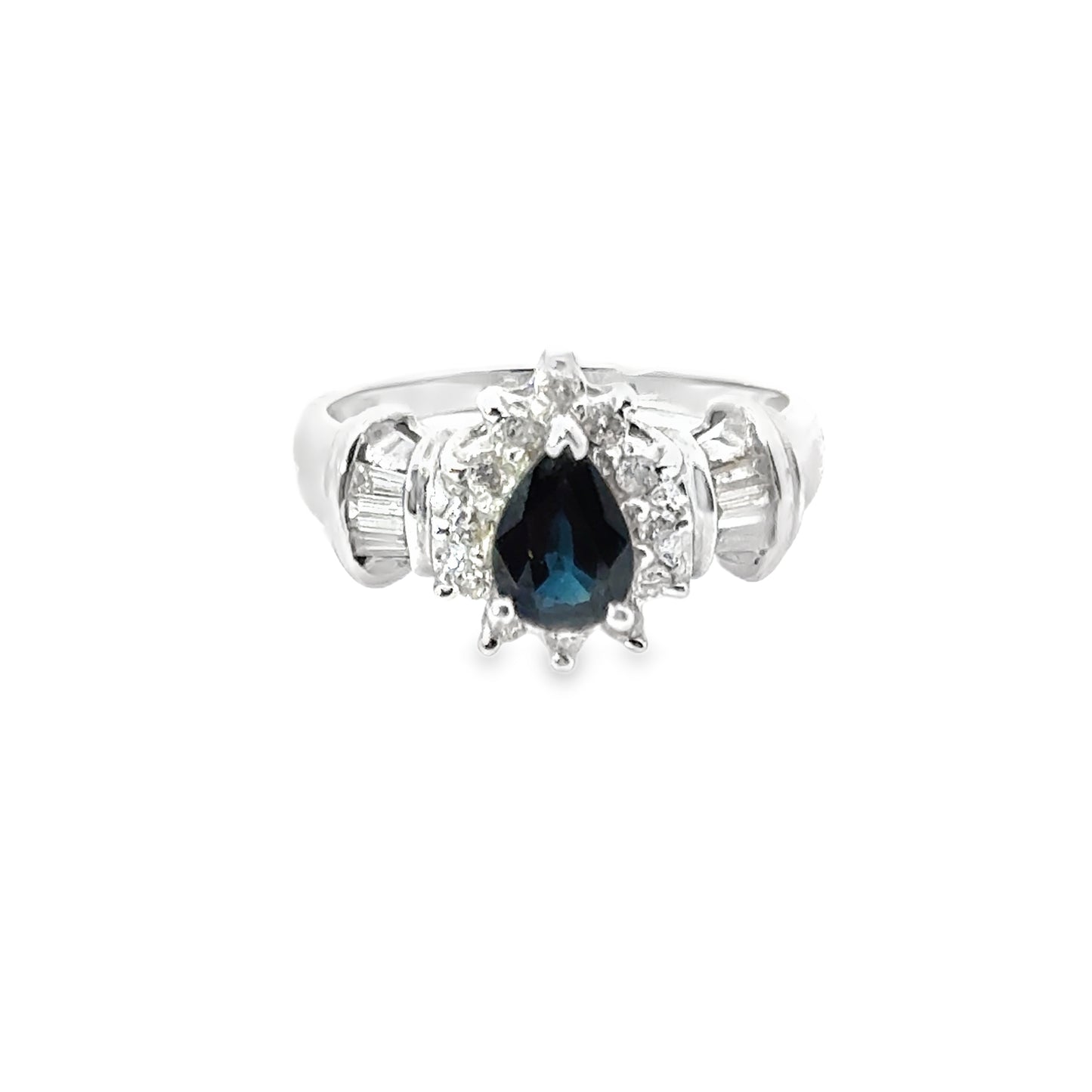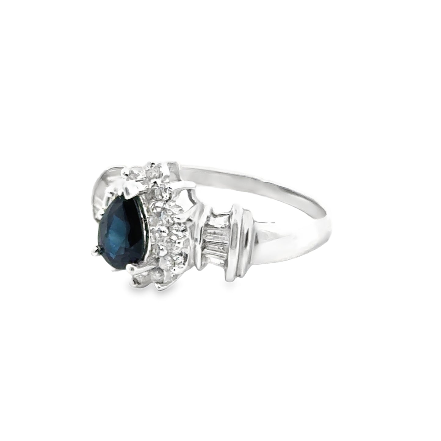 Elegant 14K white gold ring featuring a striking pear-shaped sapphire as the center stone. The deep blue sapphire is set in a prong setting, surrounded by a halo of round and baguette-cut diamonds. The round diamonds form a sparkling cluster around the top of the sapphire, while the baguette diamonds are set on either side of the central stone, enhancing the ring’s brilliance and adding dimension to the design. The white gold band is polished and smooth, providing a sleek contrast to the vibrant gemstones and giving the ring a timeless and luxurious appeal.