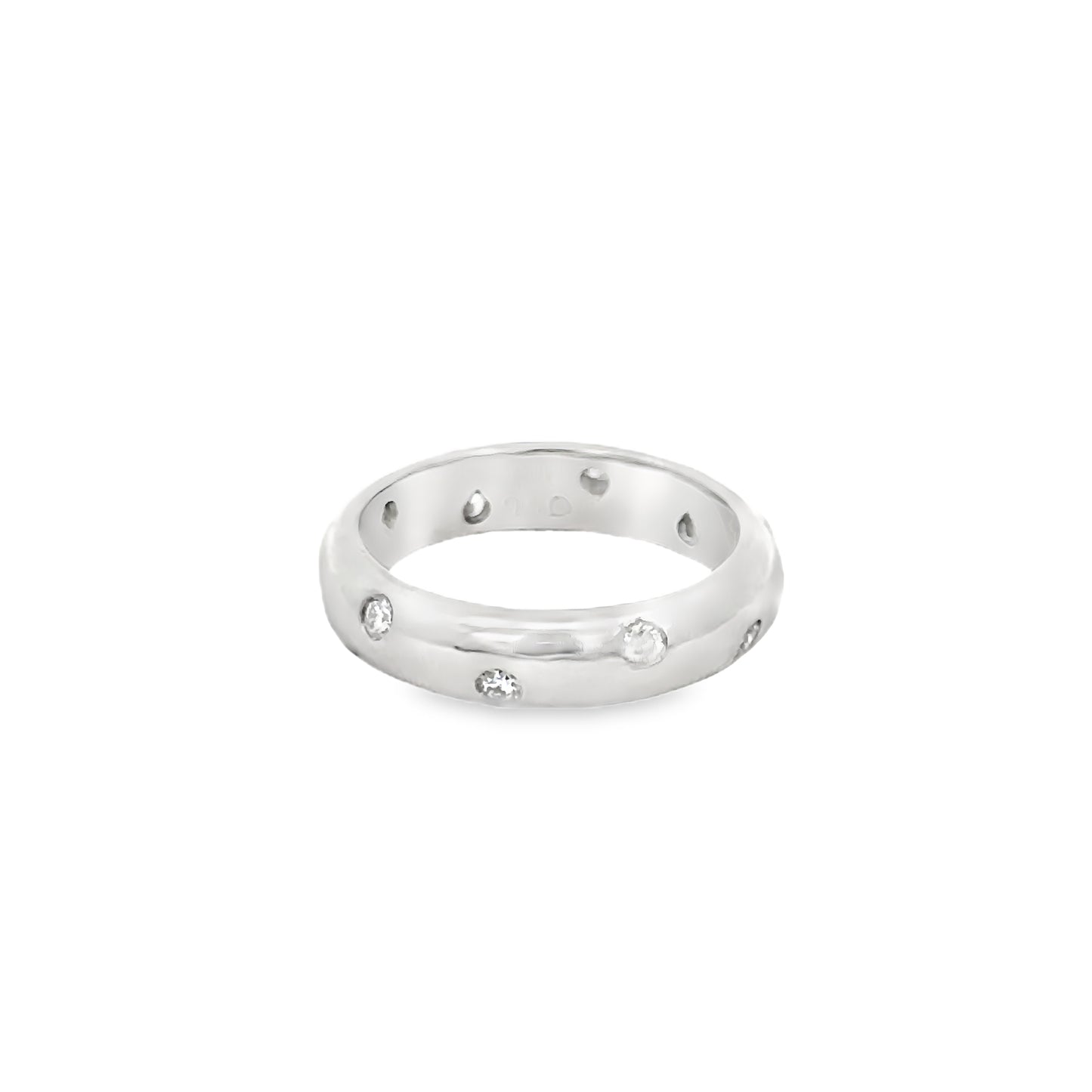 The band is set with small, round brilliant-cut diamonds that are spaced evenly around the ring. Each diamond is bezel-set, allowing the platinum to form a smooth border around each stone, which not only secures the diamonds but also enhances their sparkle by providing a reflective backdrop. The subtlety of the design makes this ring a perfect choice for everyday wear, either as a wedding band, an anniversary ring, or simply a luxurious accessory.