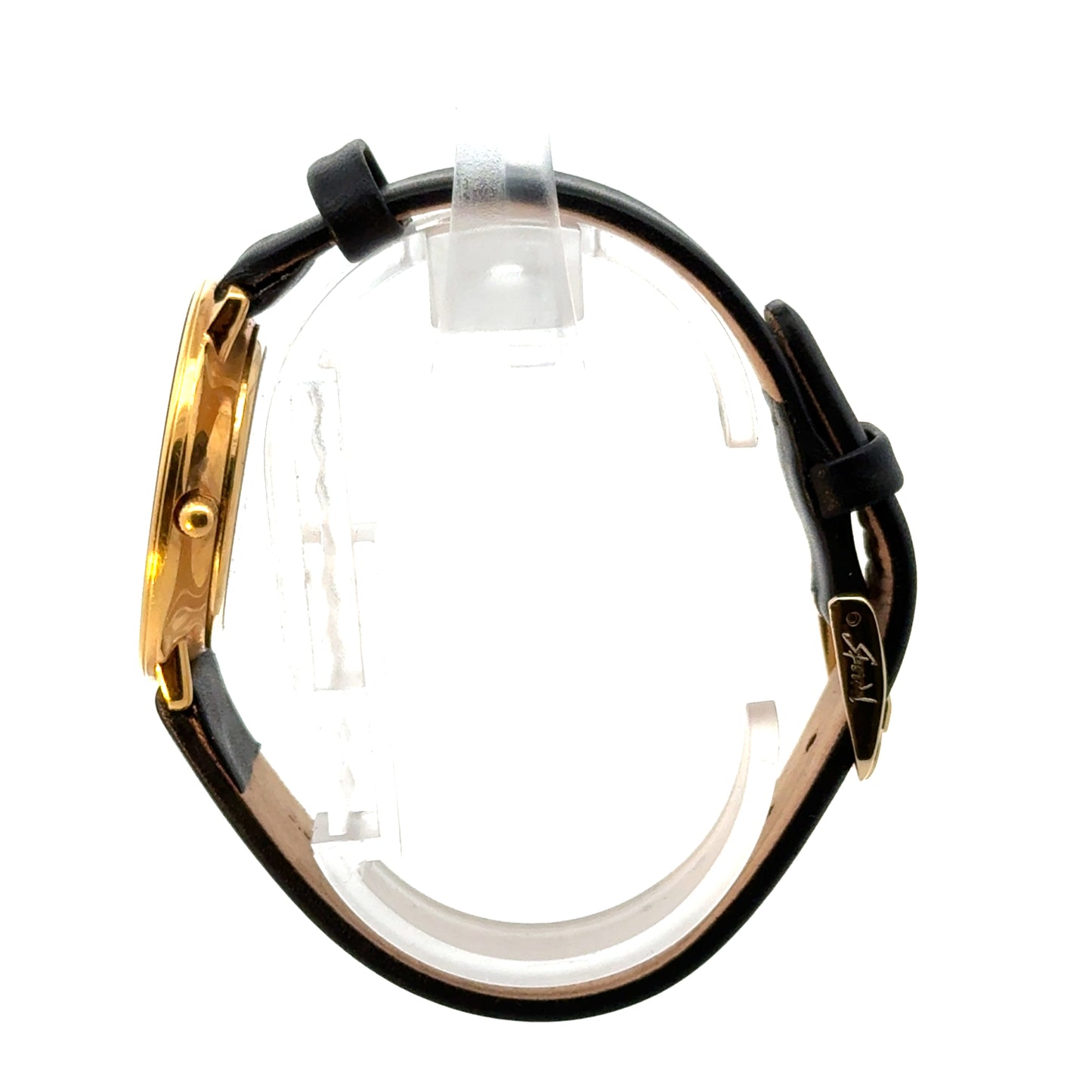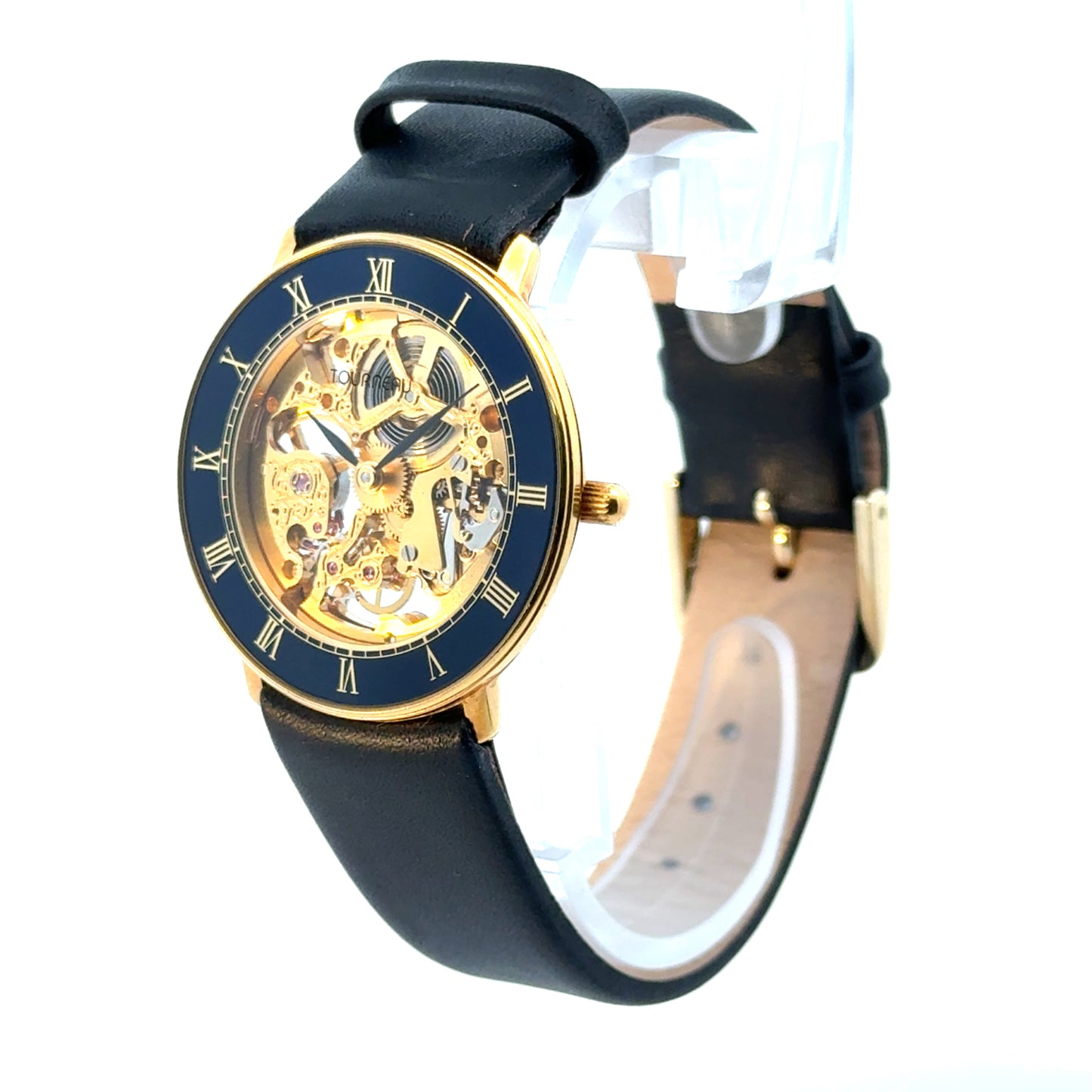 | Tourneau Skeleton Watch, 18K Yellow Gold, 33mm case, genuine black calf leather strap, automatic movement |