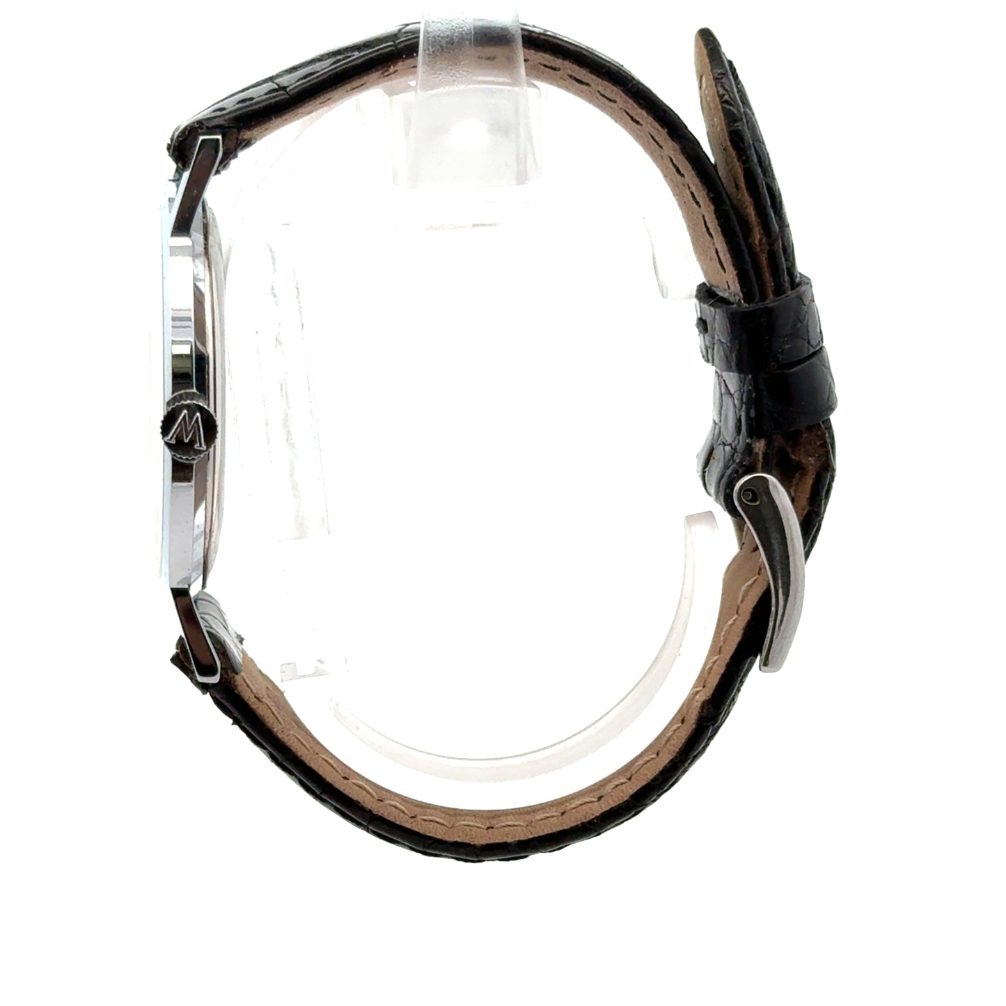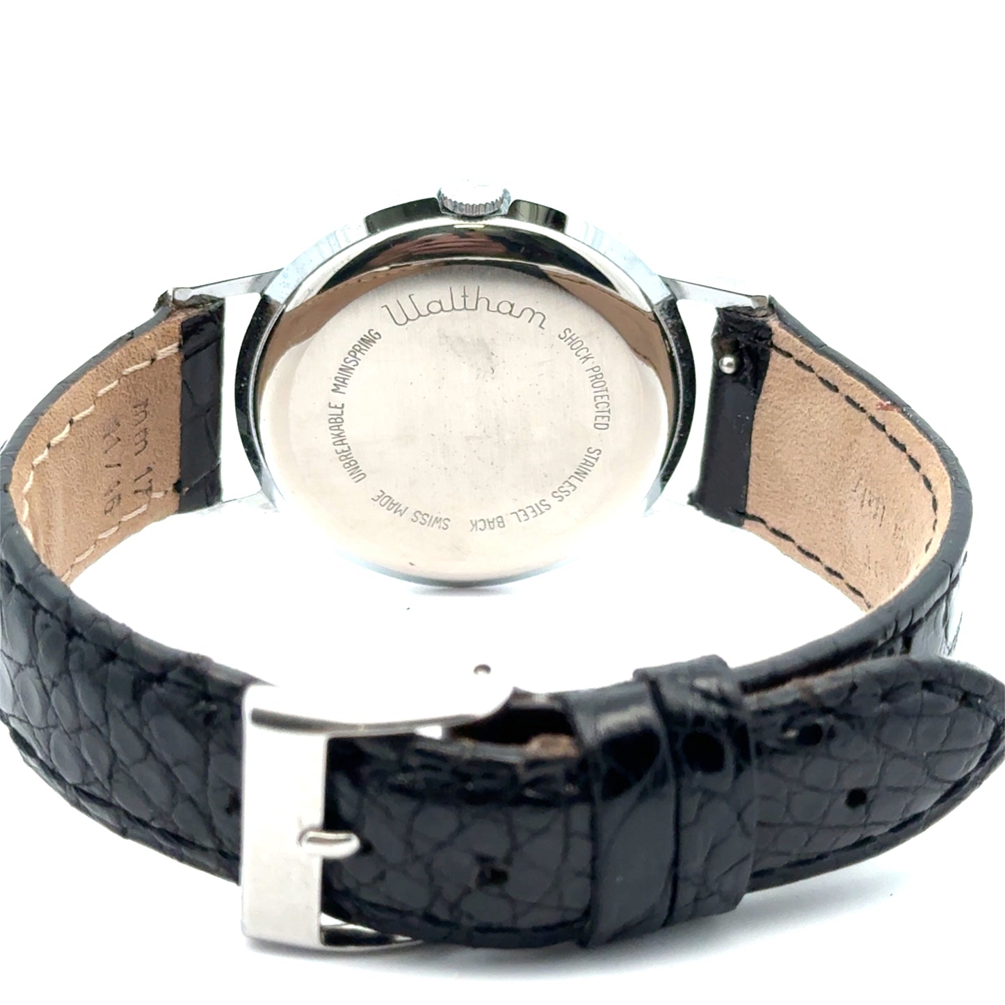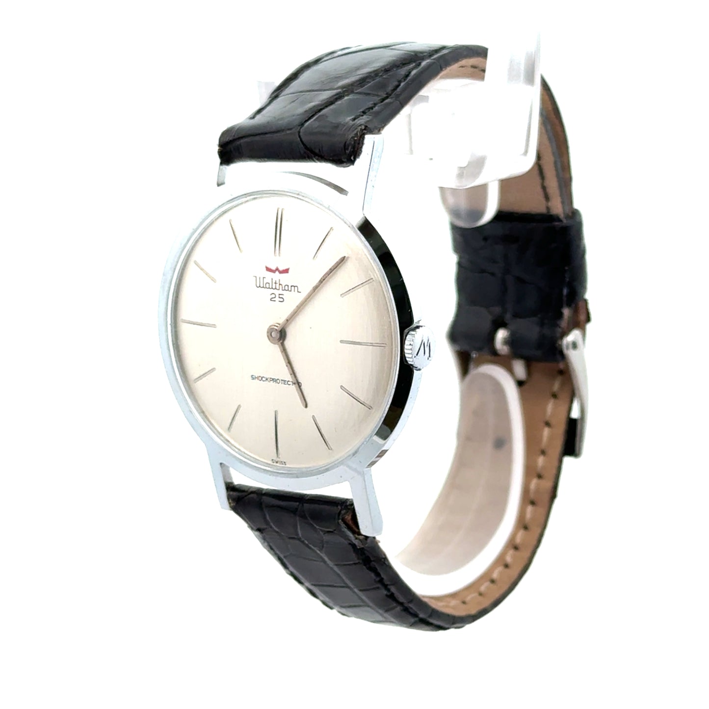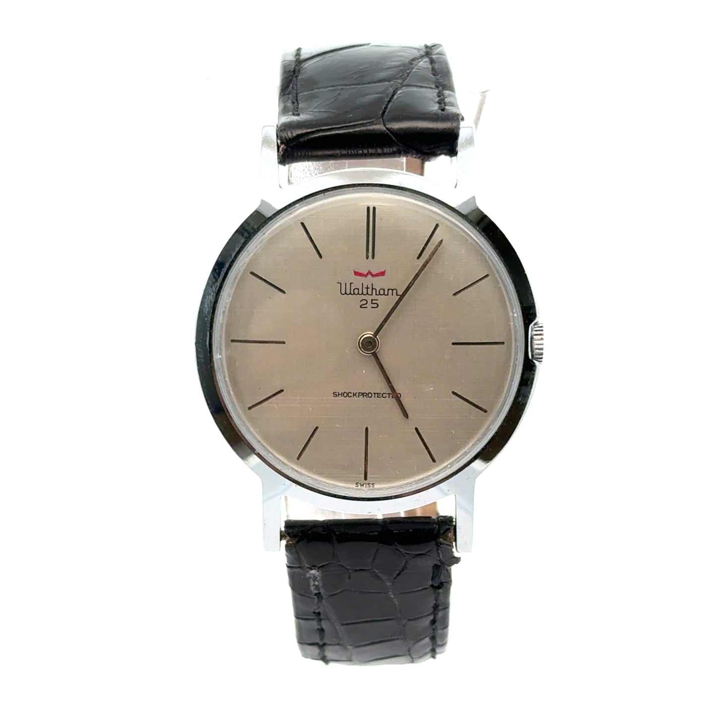 | Waltham 25, Swiss Made, 34mm thin case, shock protected, stainless steel back, unbreakable mainspring, winding movement, black alligator strap handmade in Italy |