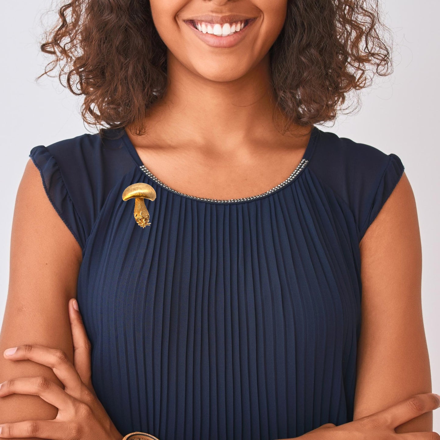 Whimsical mushroom brooch crafted in 14k yellow gold, featuring a textured finish that beautifully mimics the natural surface of a real mushroom. The cap and stem are finely detailed, with intricate goldwork at the base resembling roots or mycelium, adding a playful yet elegant touch. The brooch has a secure pin fastening on the back, making it easy to wear on clothing or accessories. This fun and creative design is perfect for nature lovers and those seeking a unique statement piece.
