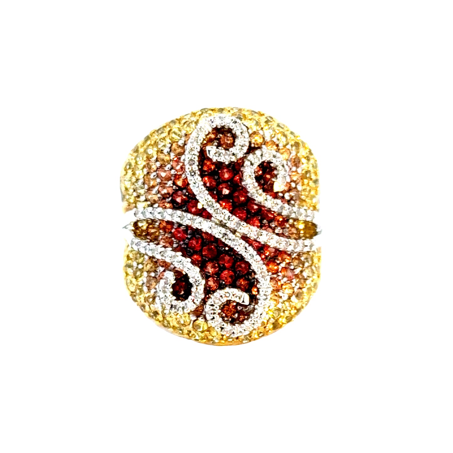 | 14K, White Gold, Yellow Sapphires, Orange Sapphires, Diamonds 3.5 ct., Size 9 | Approx. 13.5 Grams |