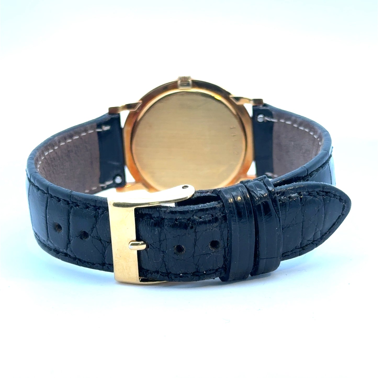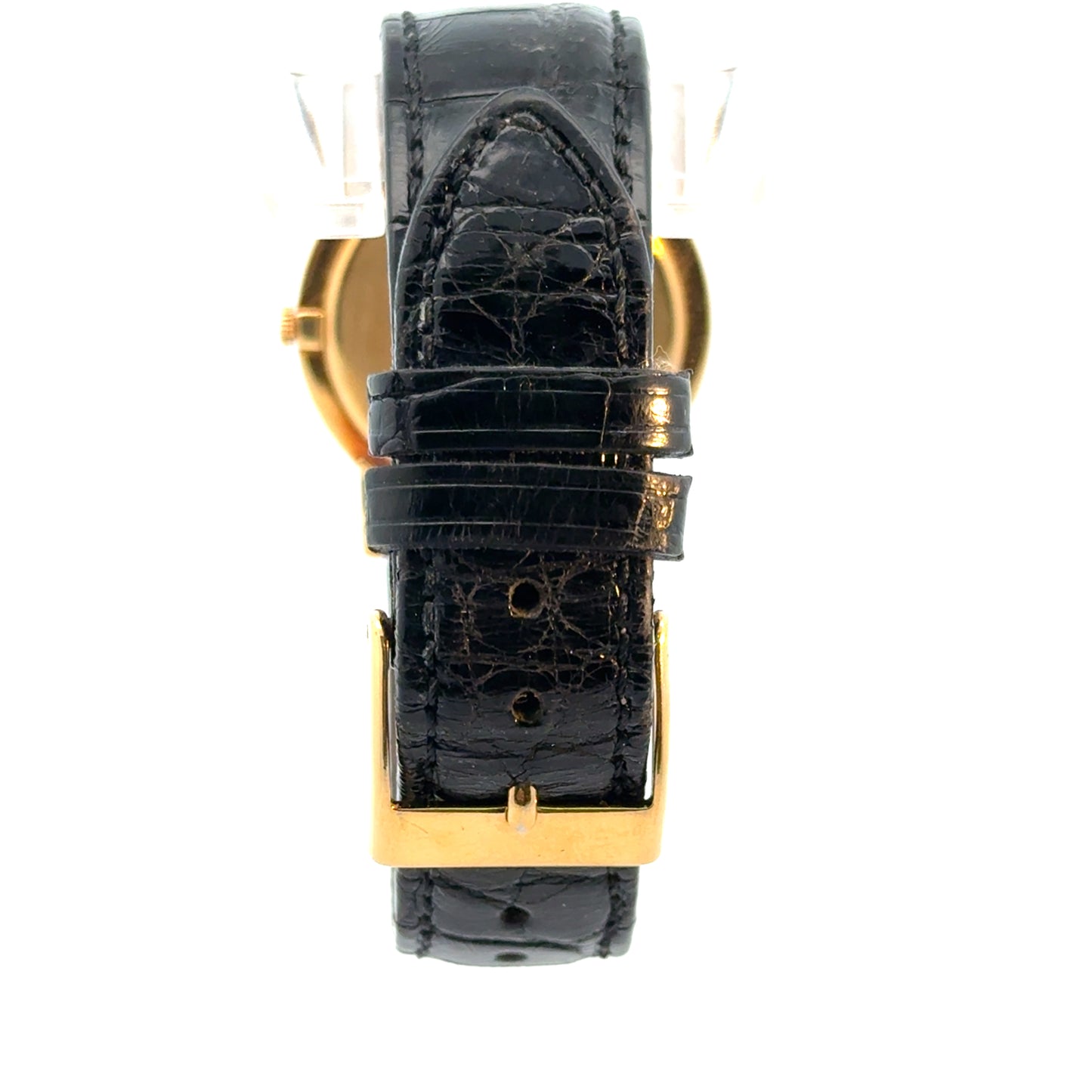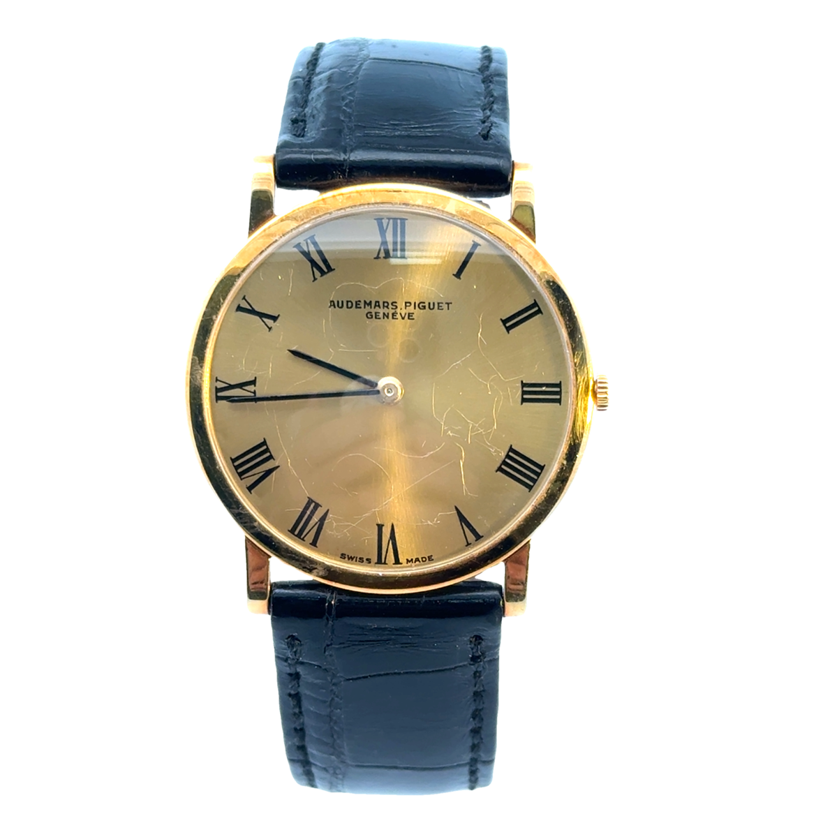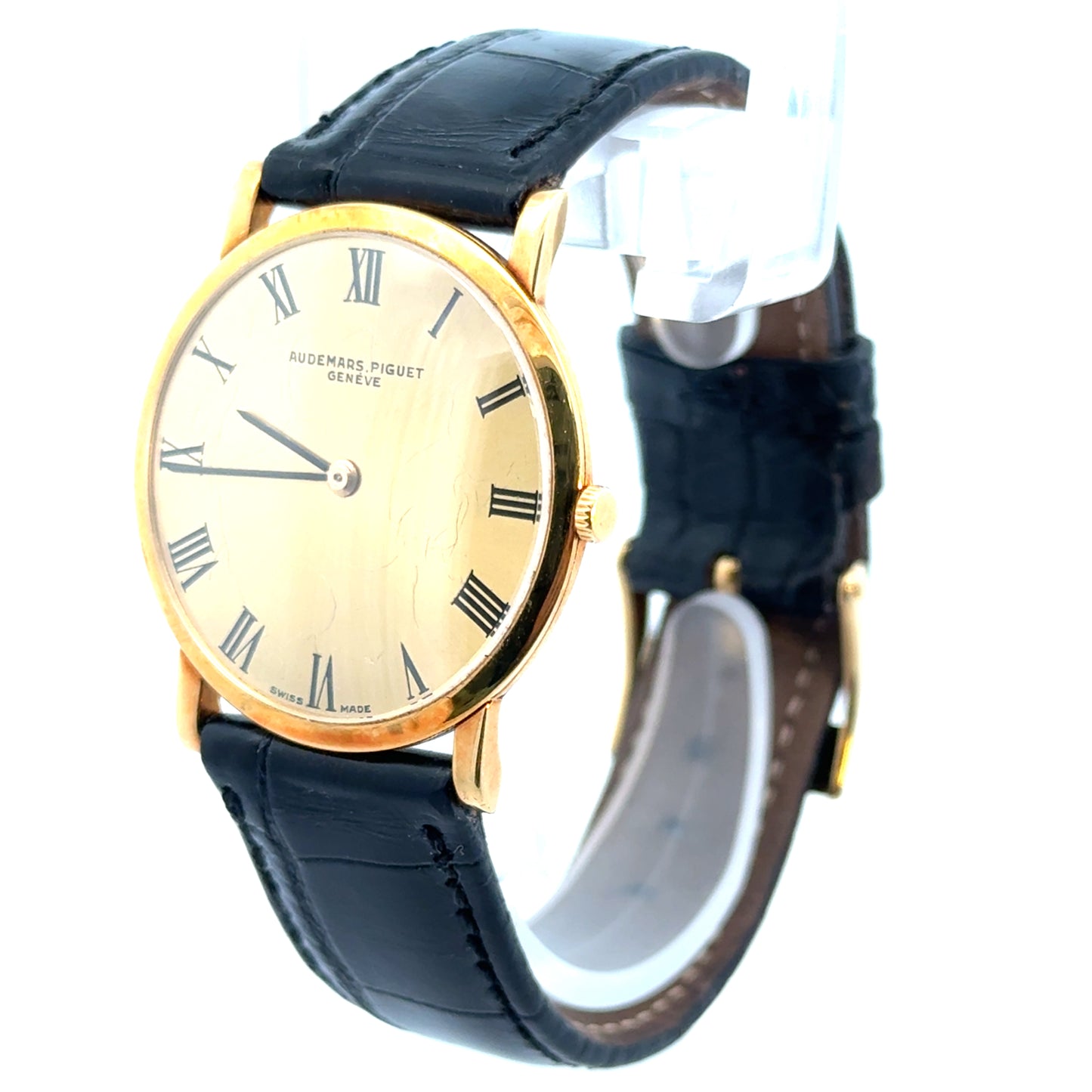 | Audemars Piguet, # 18162, 18K Yellow Gold, ultra thin 31mm case, black leather strap |