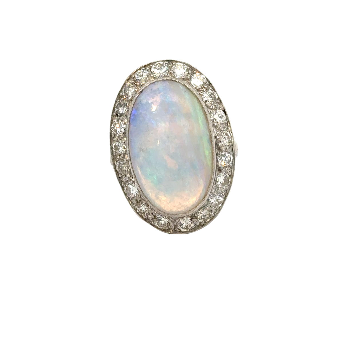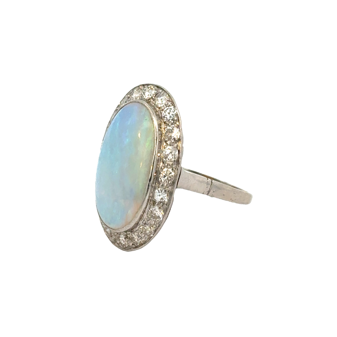 This ring's combination of platinum, opal, and diamonds gives it an opulent and elegant appeal, making it a standout piece with a truly mesmerizing shimmer. Perfect for someone with an appreciation for classic sophistication and unique, shimmering gemstones.
