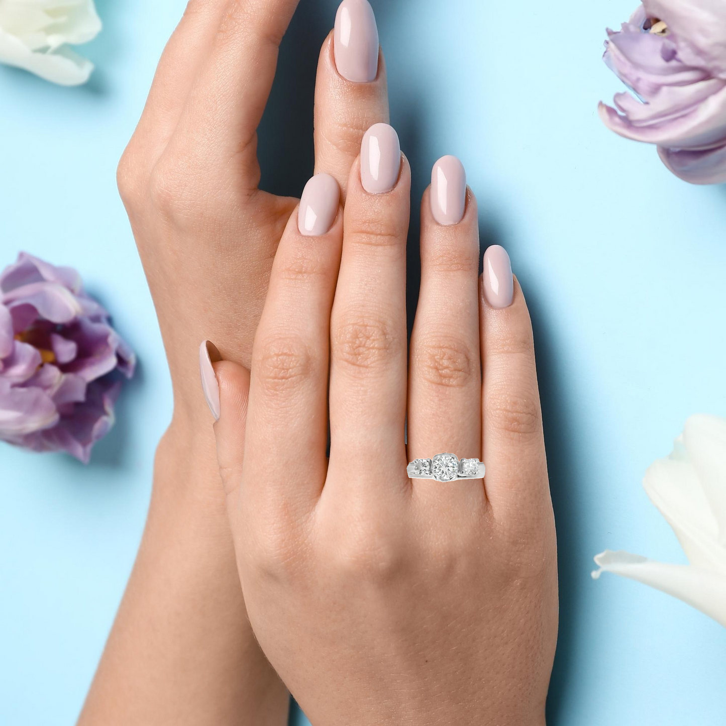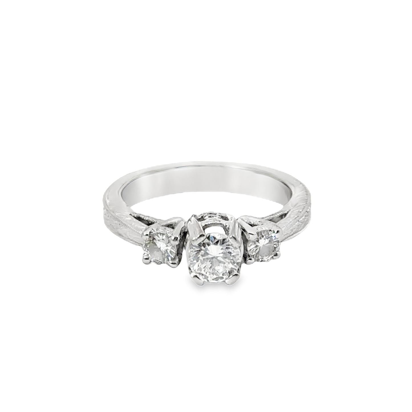 Stunning vintage engagement ring features a beautiful 14K white gold band that showcases three dazzling diamonds. The central diamond is slightly larger, drawing attention to the heart of the design, while two smaller diamonds flank it on either side. The diamonds are set in a raised prong setting, allowing maximum light to reflect and enhance their brilliance.