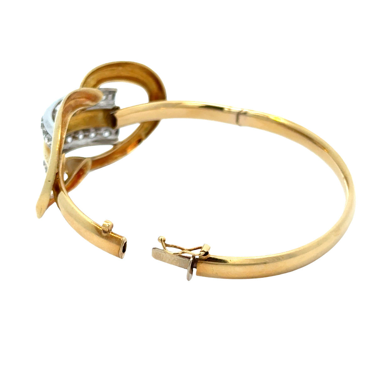 This elegant bangle bracelet is crafted in solid 18K yellow gold and features a graceful intertwined knot motif accented with 20 sparkling diamonds. The sculptural front design combines polished yellow gold with diamond-set white gold elements, creating a refined two-tone contrast that adds brilliance and depth.