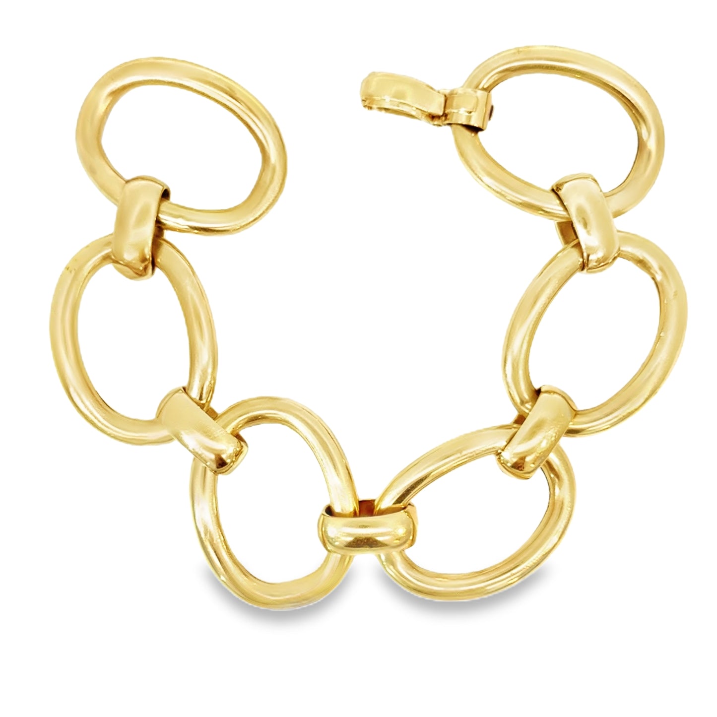 This stunning Italian-made 18k polished yellow gold link bracelet is a bold yet timeless statement piece. Crafted with large, elegantly contoured oval links, the bracelet exudes a modern, trendy aesthetic while maintaining a classic appeal.