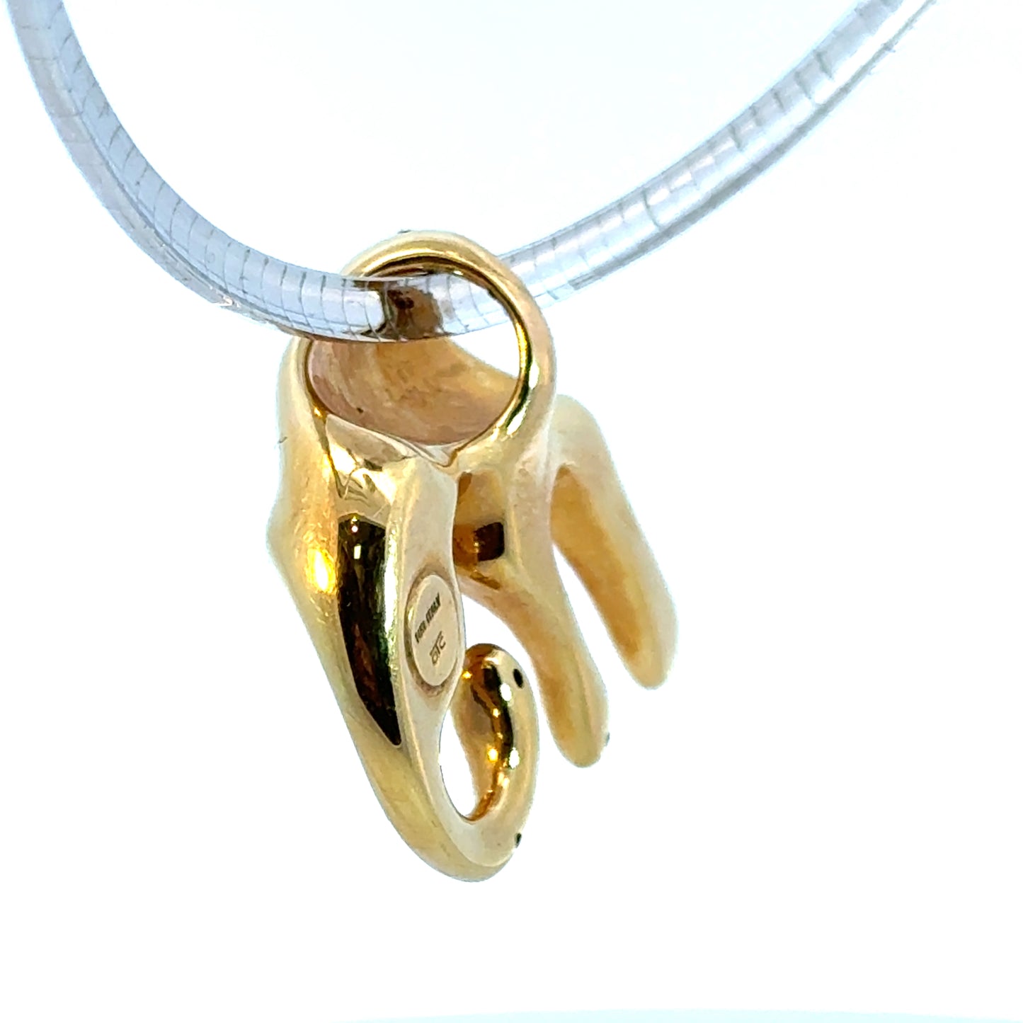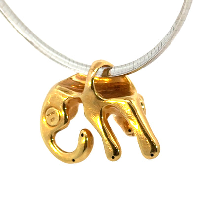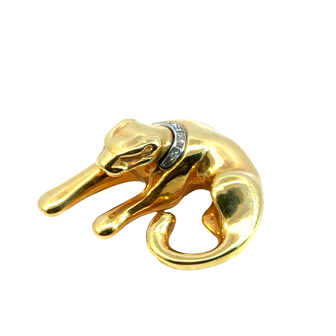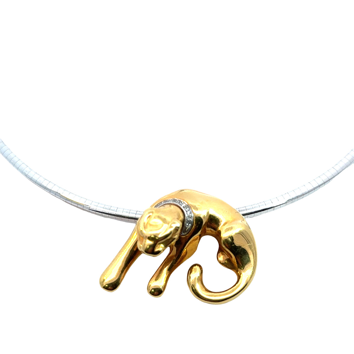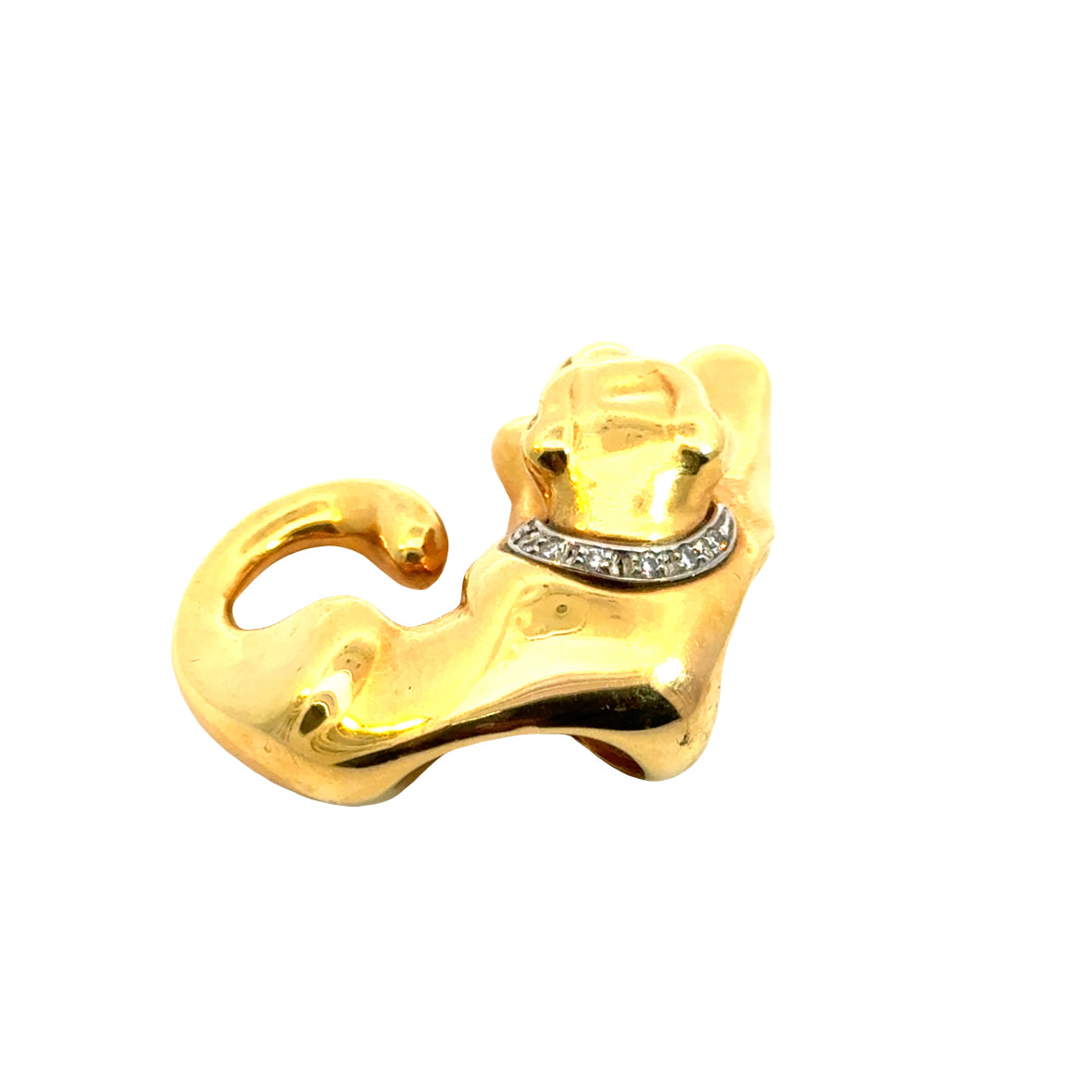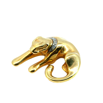 Striking and sculptural, this 14K yellow gold puffed pendant features a sleek, stylized panther in a graceful crouching pose. The panther is adorned with a collar of sparkling accent diamonds set in white gold, adding a touch of brilliance to its bold form. The design is beautifully dimensional and highly polished, making it a standout piece. Chain not included. Marked for gold purity and quality on the reverse. A powerful statement piece perfect for collectors and lovers of feline elegance.