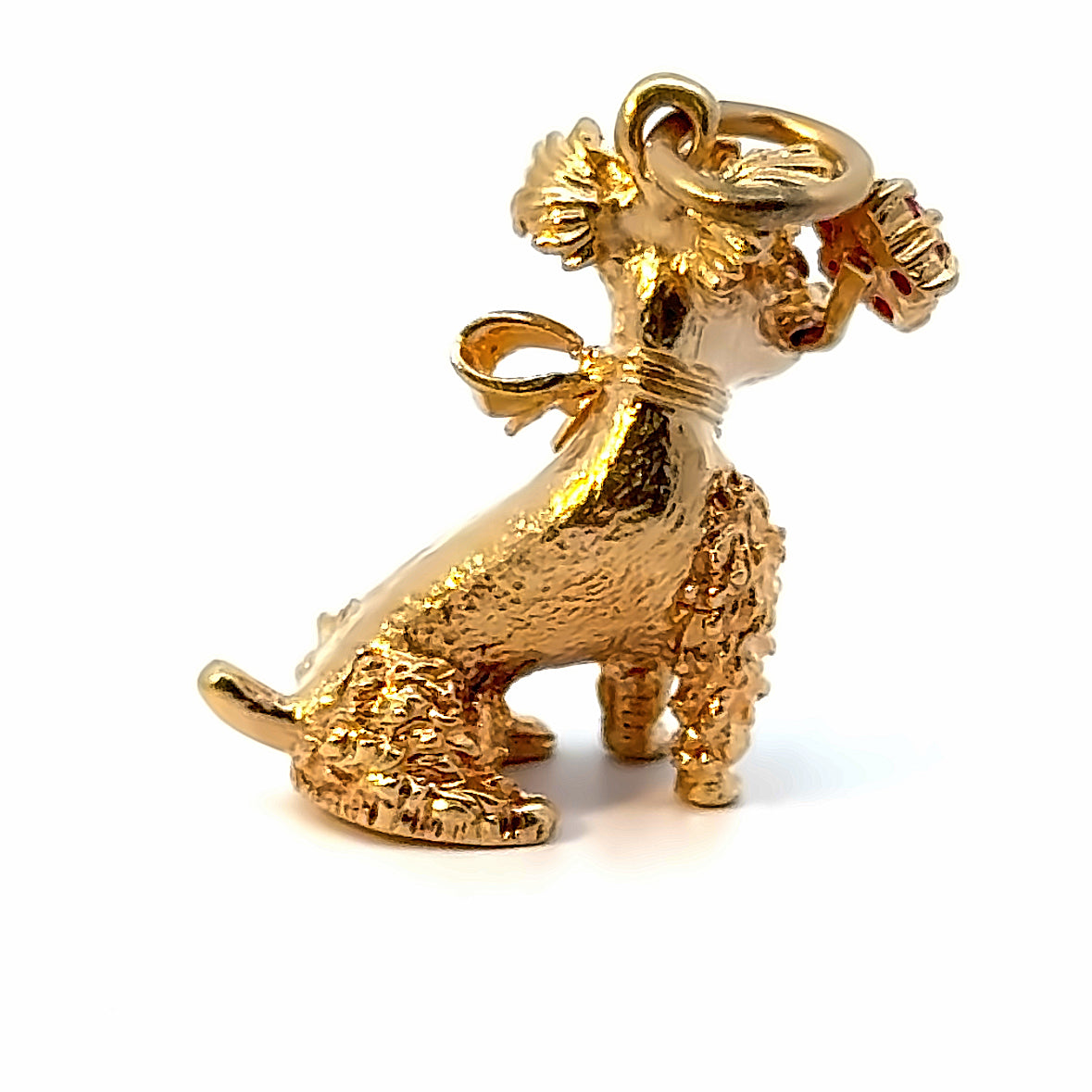 Super cute dog charm in 14K yellow gold, with floppy ears, a bow at the neck, and a red flower in its mouth. The flower adds color and luxury with the beautiful ruby and diamond design. Very detailed and very cute!