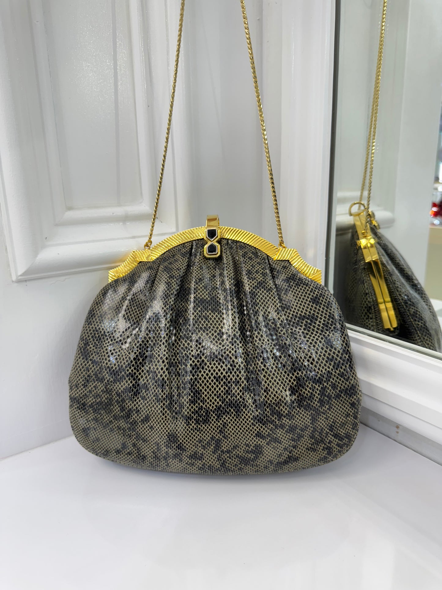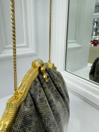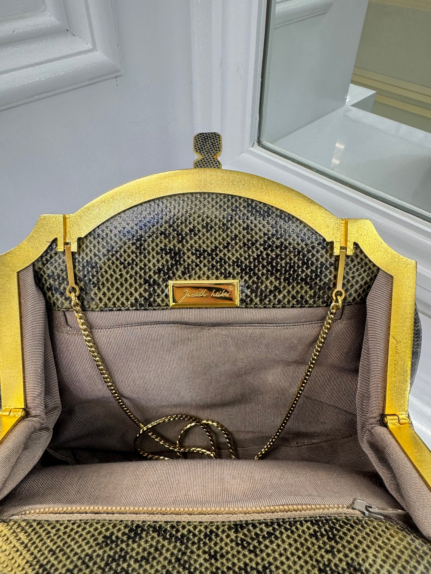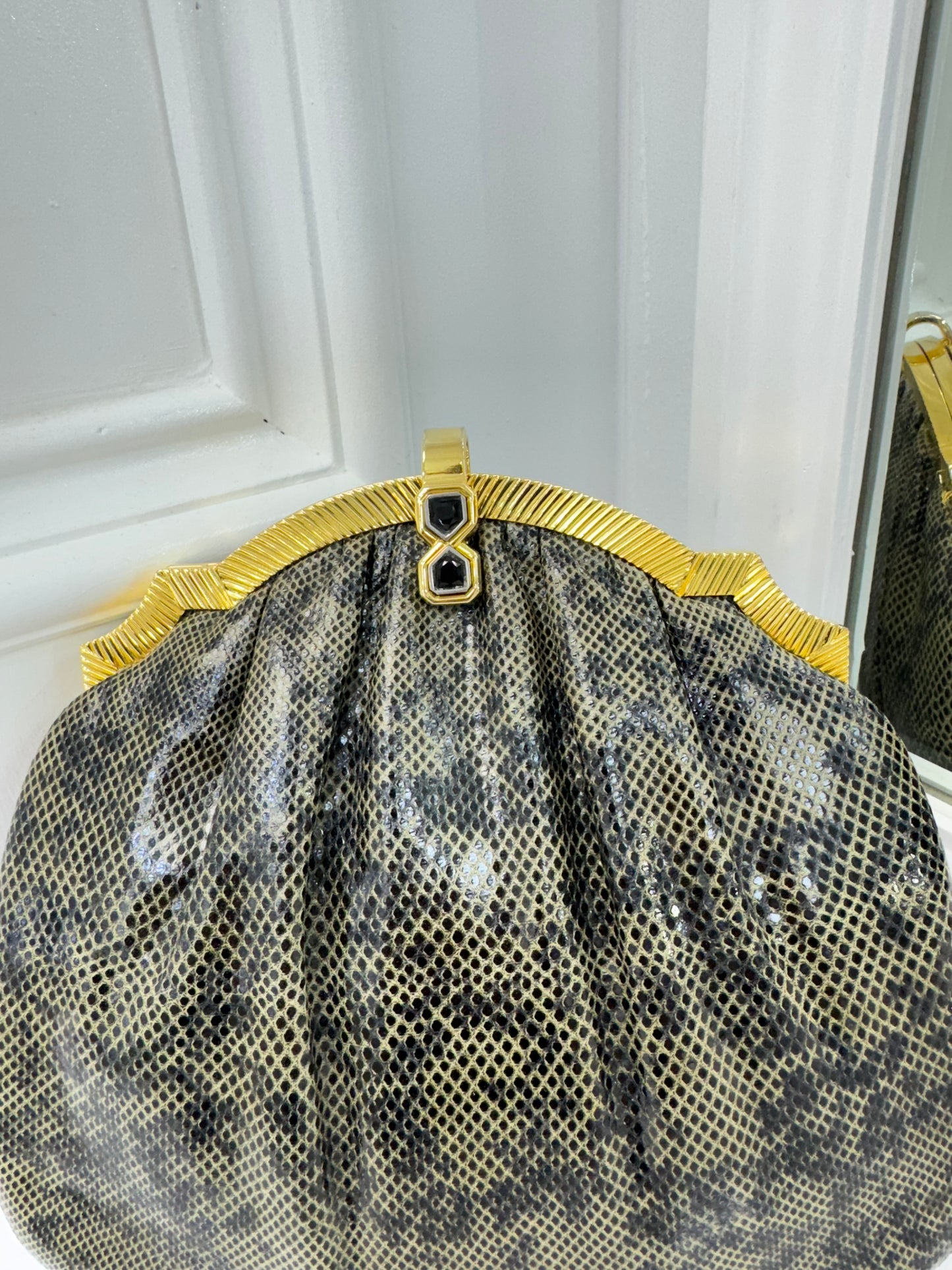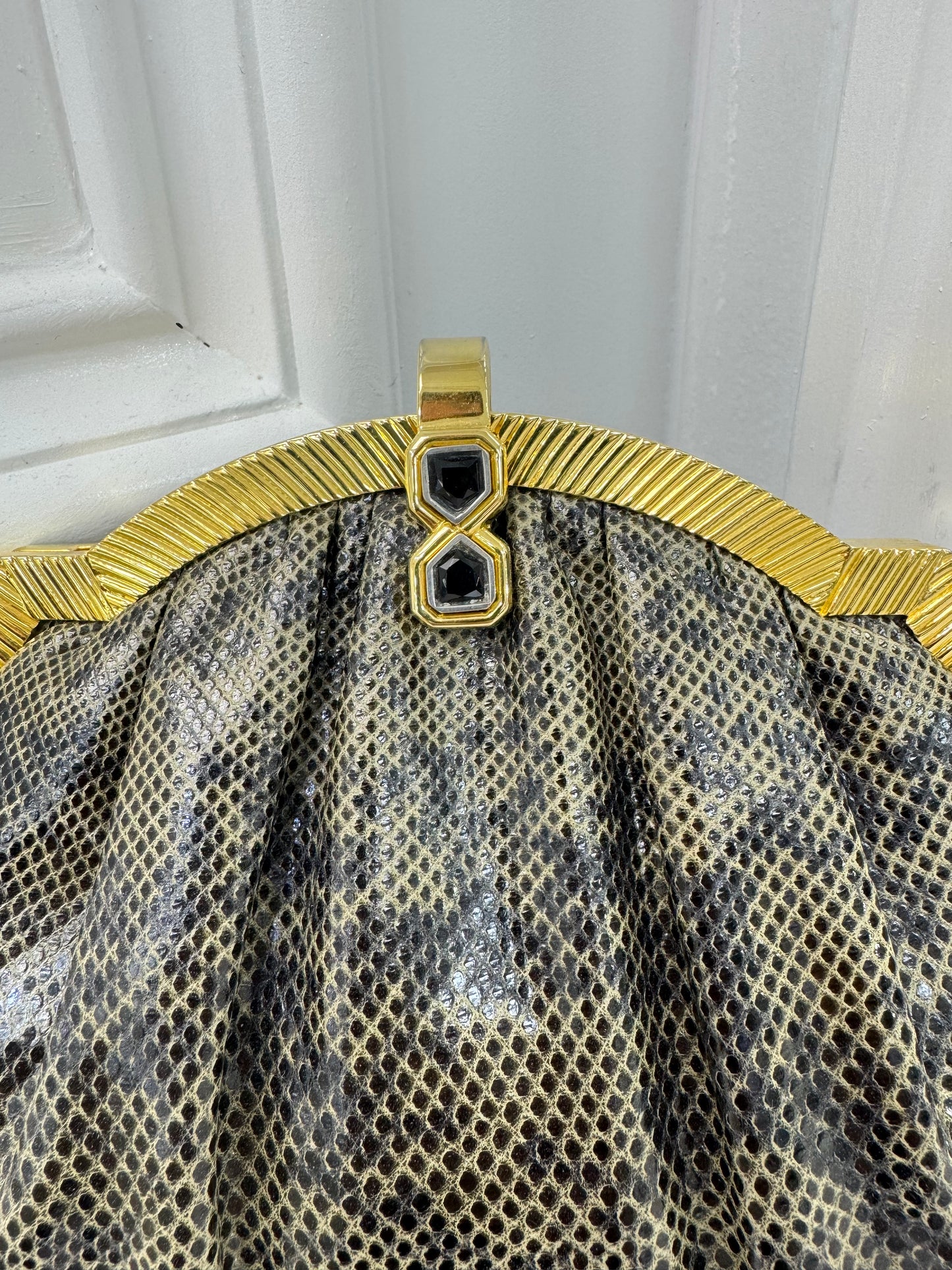 Exude timeless glamour with this exquisite Judith Leiber evening bag, crafted in a striking snakeskin-style finish with rich gold-tone hardware and a crystal-embellished clasp. A true vintage treasure, this structured minaudière features elegant pleating, a sleek top-handle frame, and a hidden chain strap with a 19-inch drop that neatly tucks inside for versatile carry options.