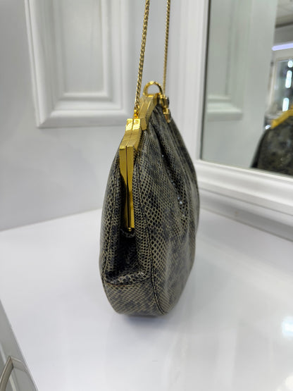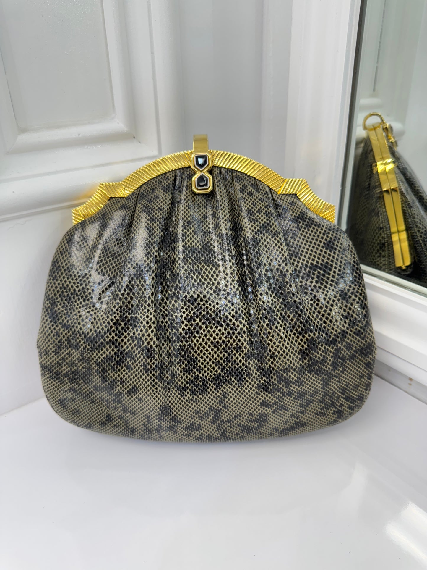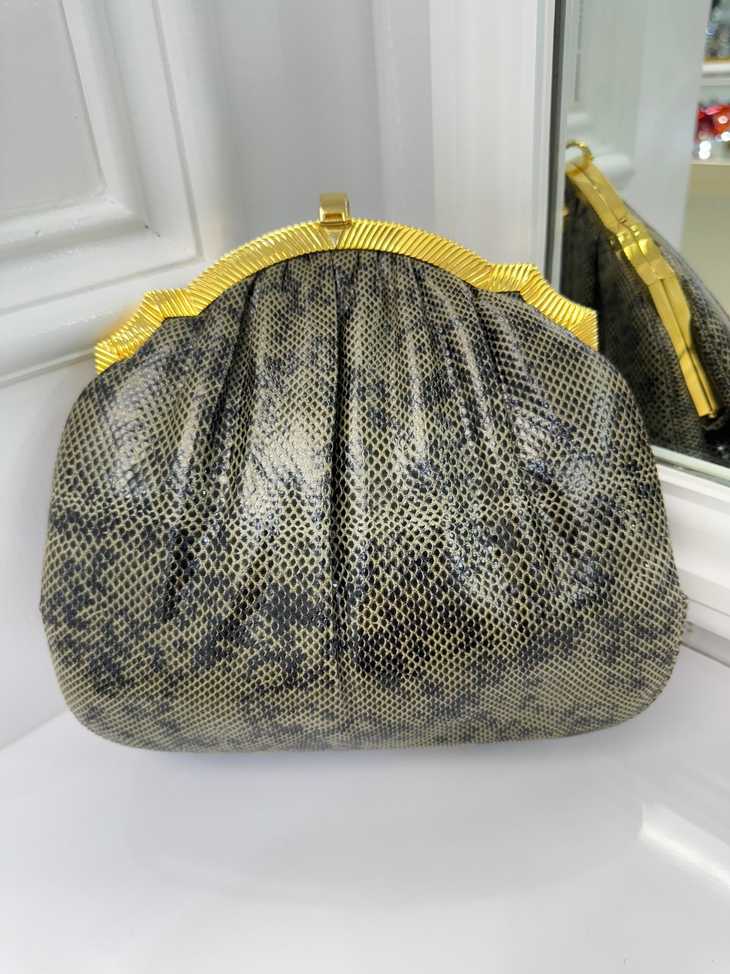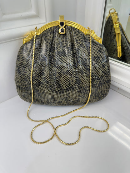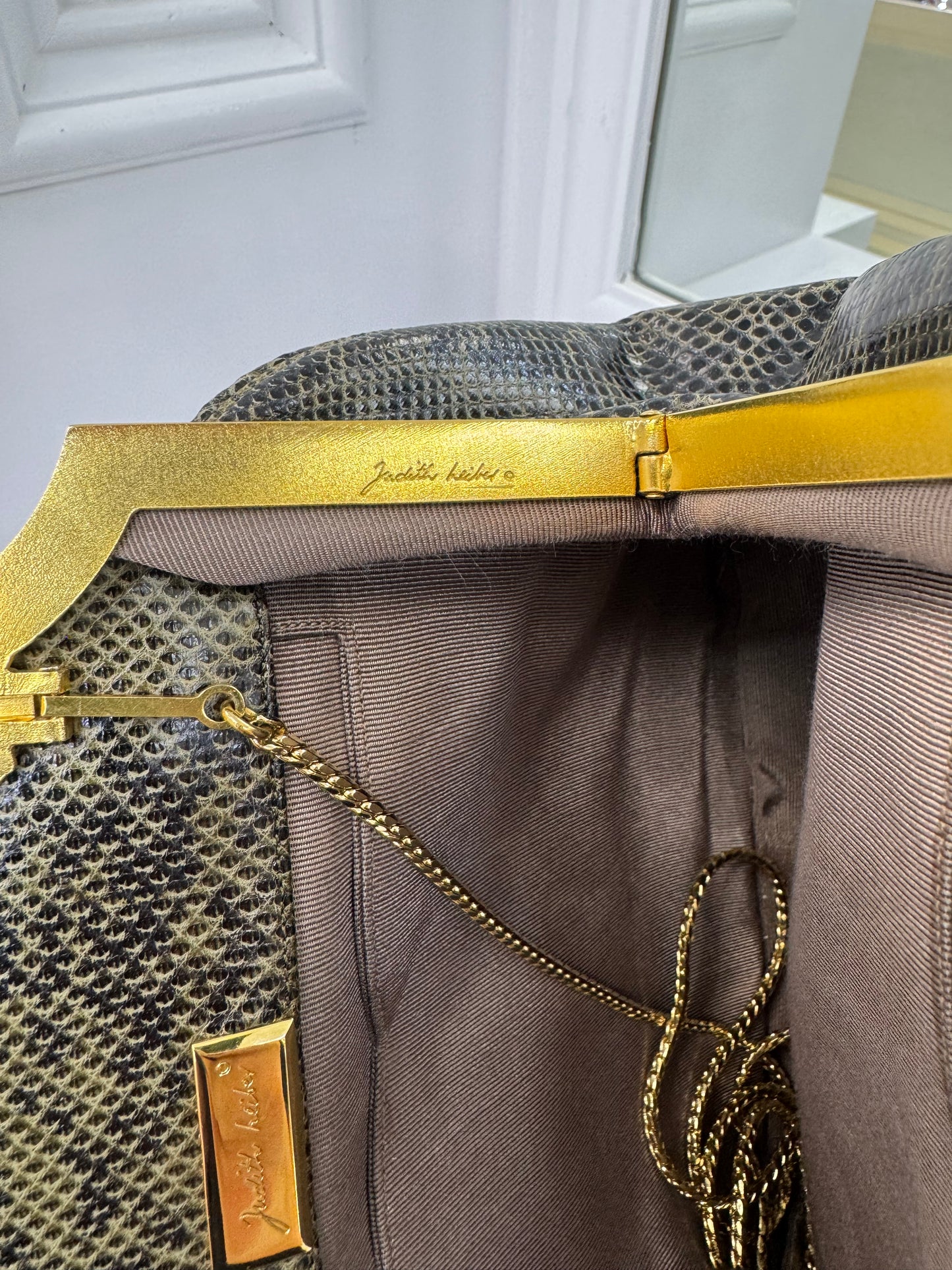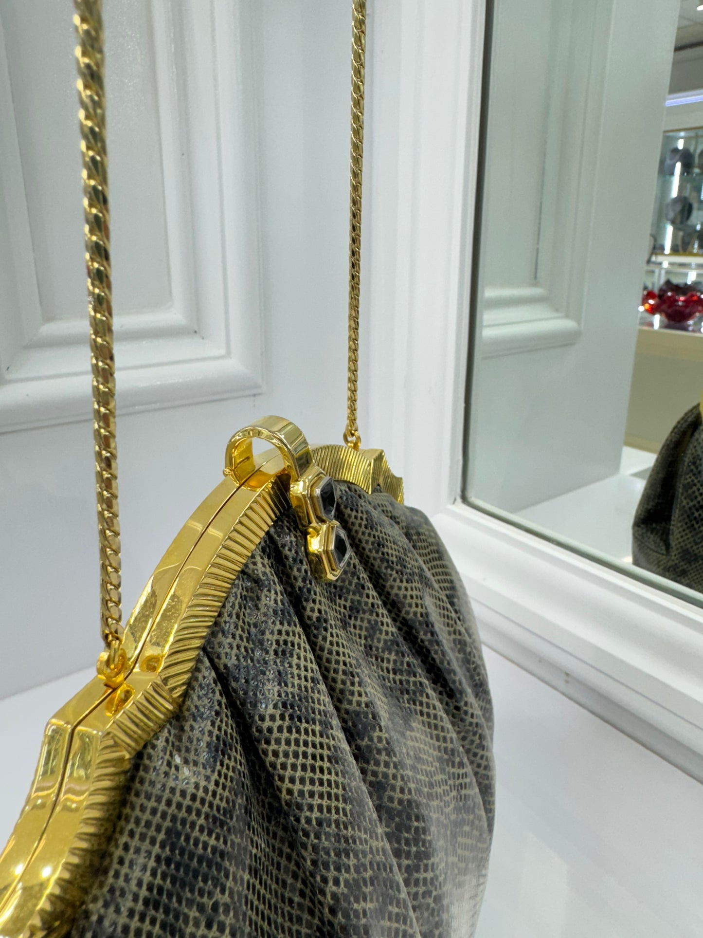 Exude timeless glamour with this exquisite Judith Leiber evening bag, crafted in a striking snakeskin-style finish with rich gold-tone hardware and a crystal-embellished clasp. A true vintage treasure, this structured minaudière features elegant pleating, a sleek top-handle frame, and a hidden chain strap with a 19-inch drop that neatly tucks inside for versatile carry options.
