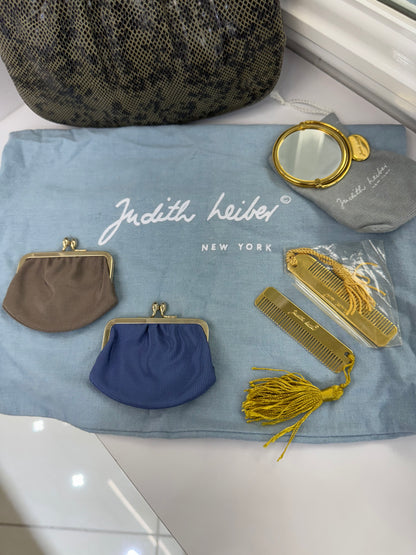 - Includes: Two mini coin purses, gold-tone comb (x2), Judith Leiber mirror in pouch, original dust bag