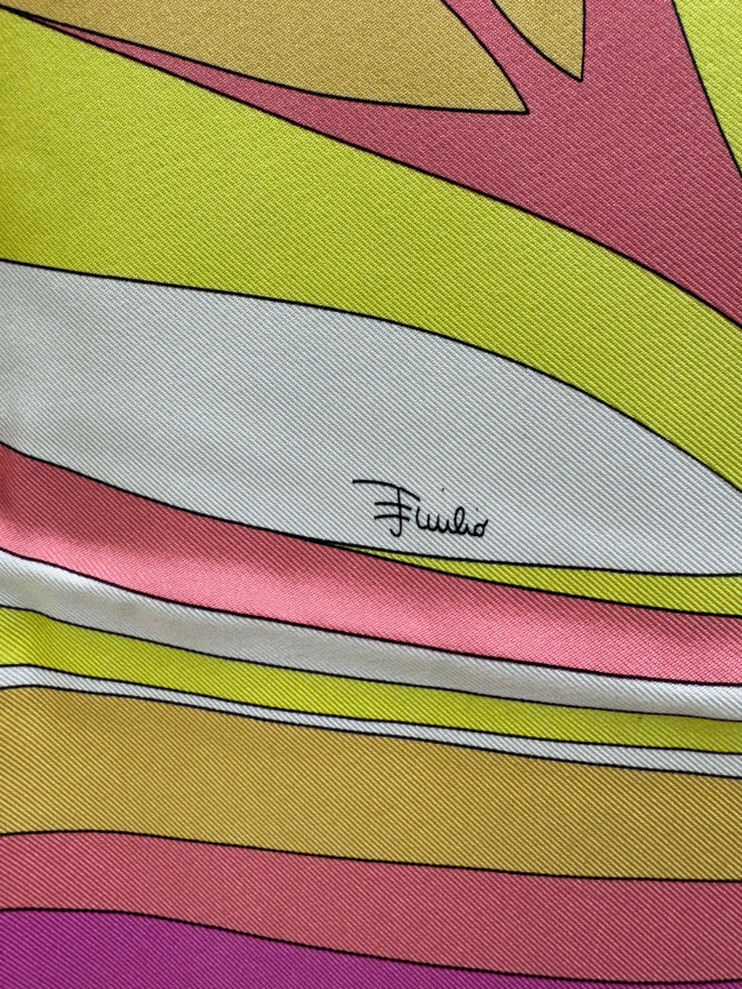 Stunning Emilio Pucci scarf. Crafted from 100% silk, this luxurious square scarf features Pucci’s signature psychedelic abstract floral pattern in vibrant shades of pink, yellow, lavender, and orange, accented with the designer’s hand-drawn signature throughout.