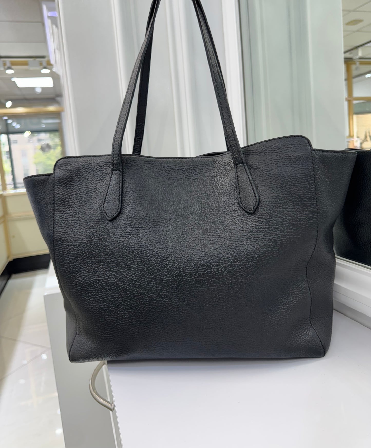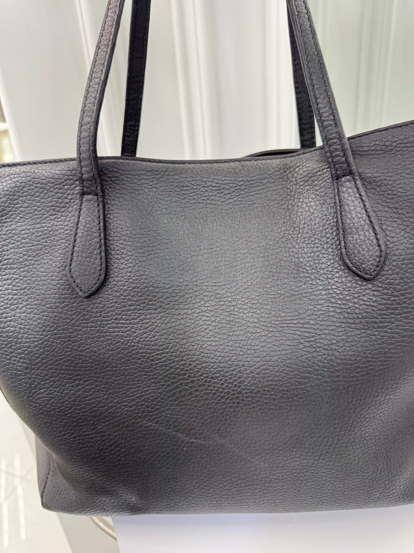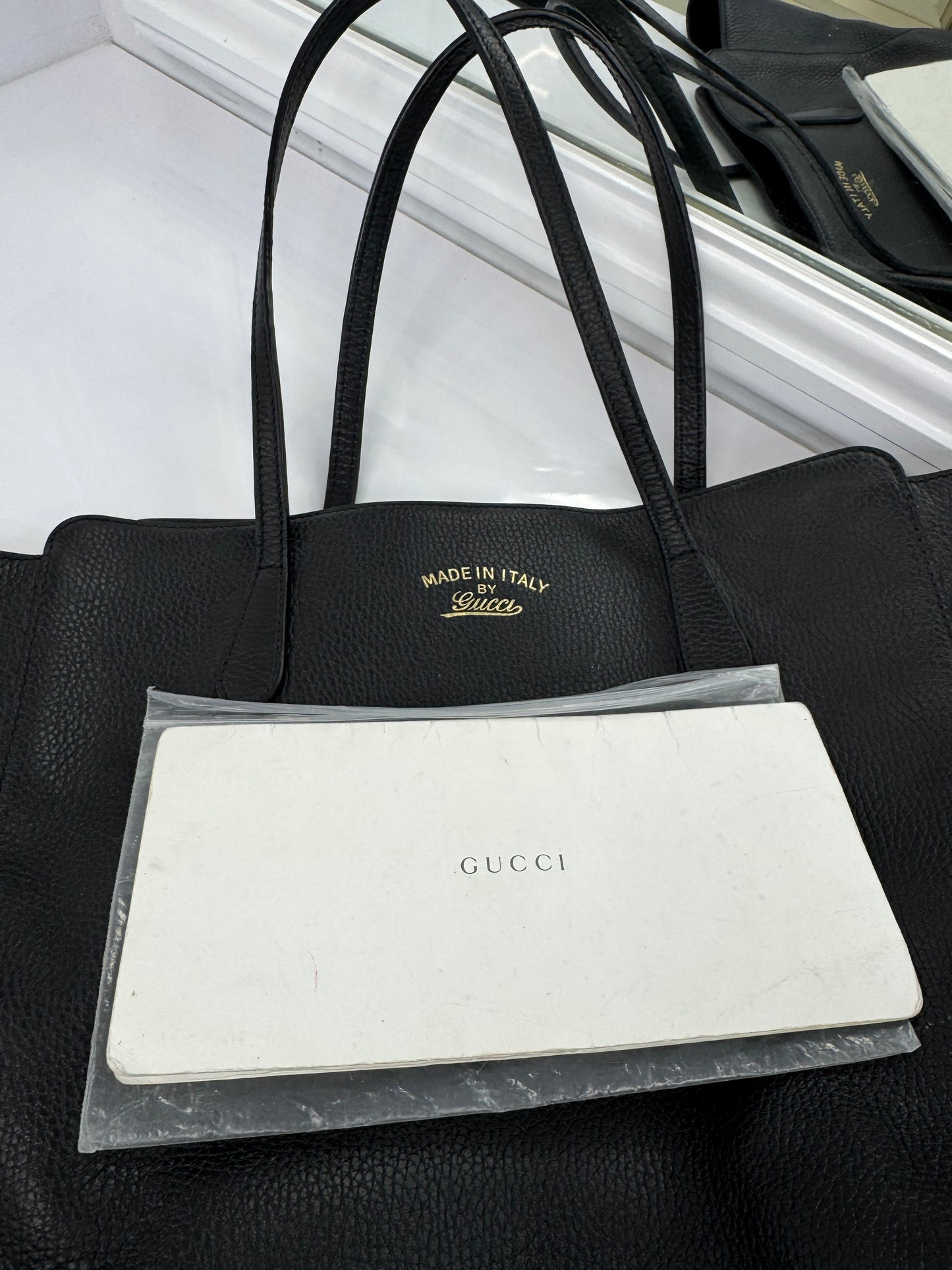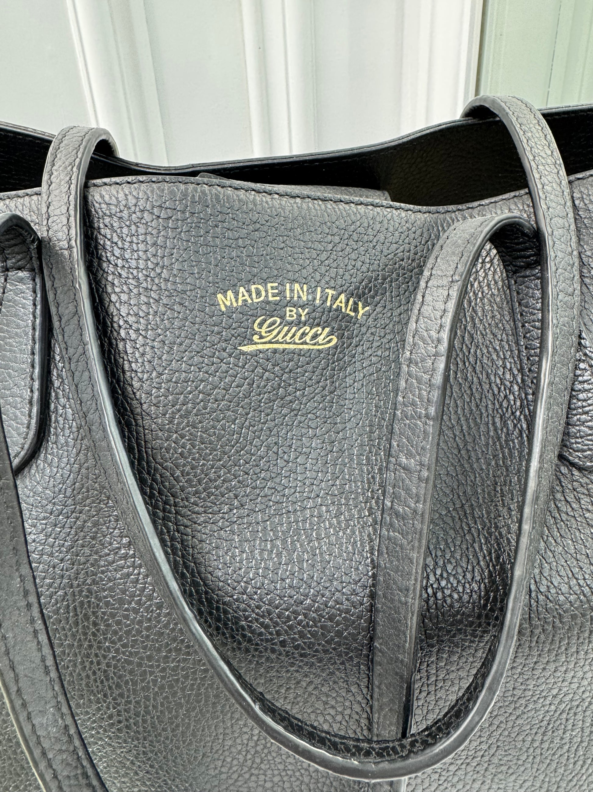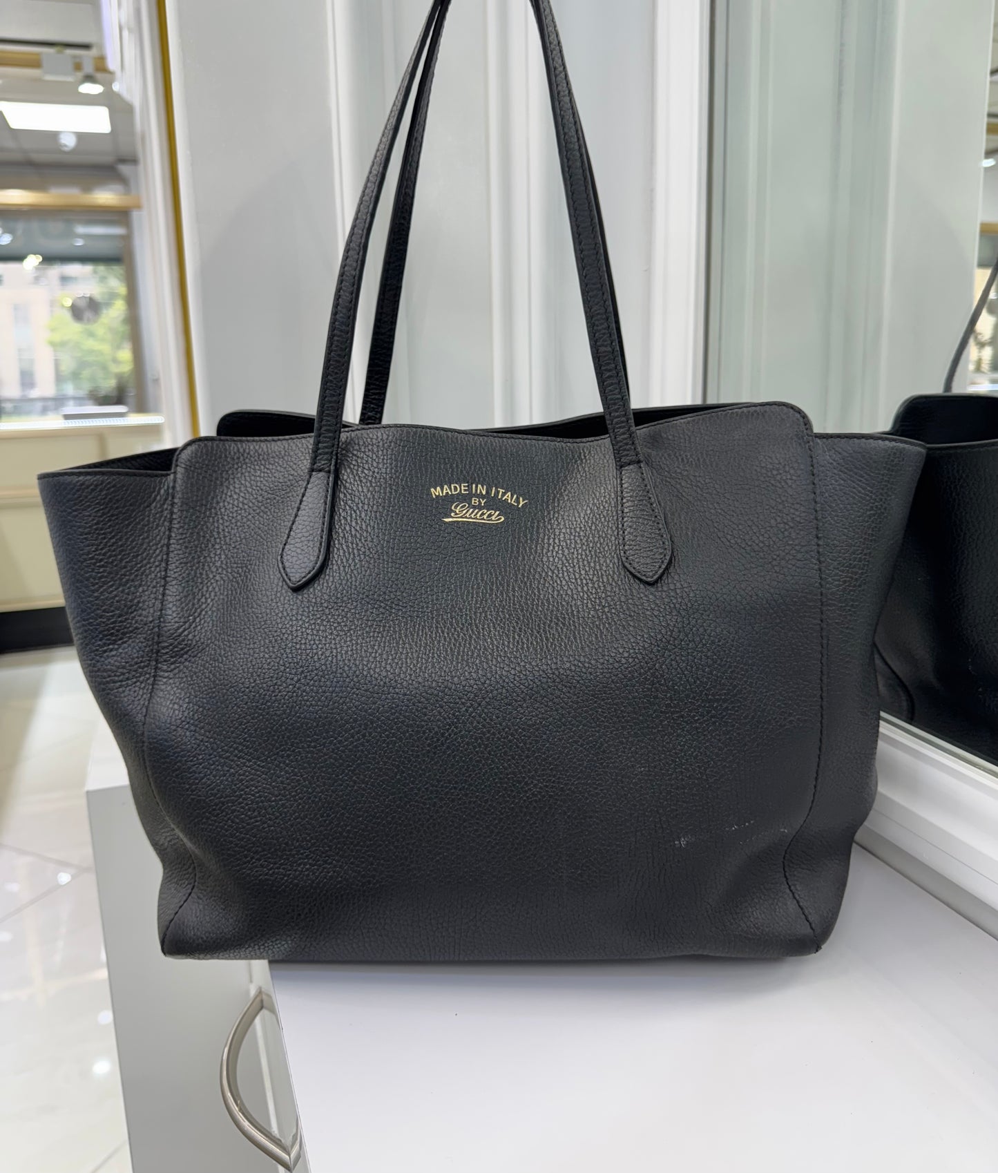 Authentic Gucci Swing tote crafted in rich black grained leather. Made in Italy, this structured yet spacious tote features dual top handles, a soft beige canvas interior, and gold-tone embossed logo detailing that adds a subtle designer finish.