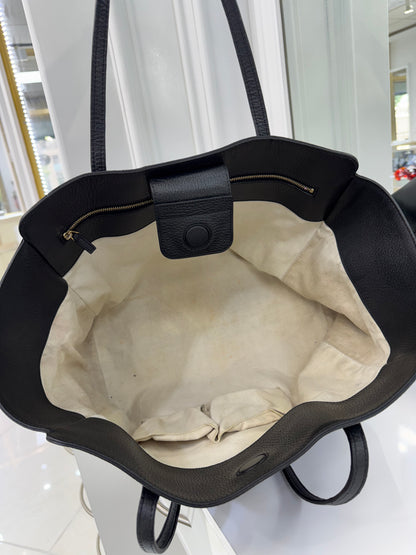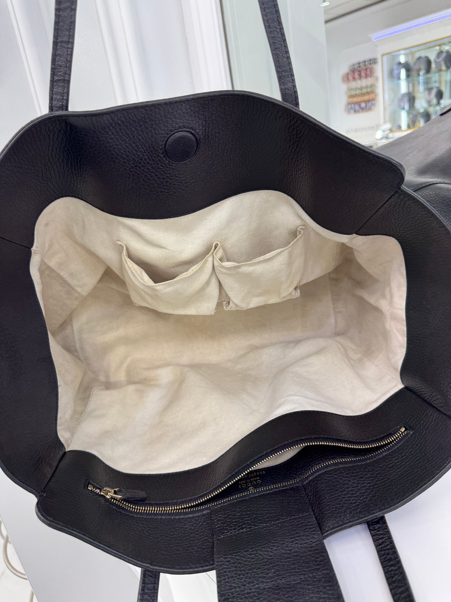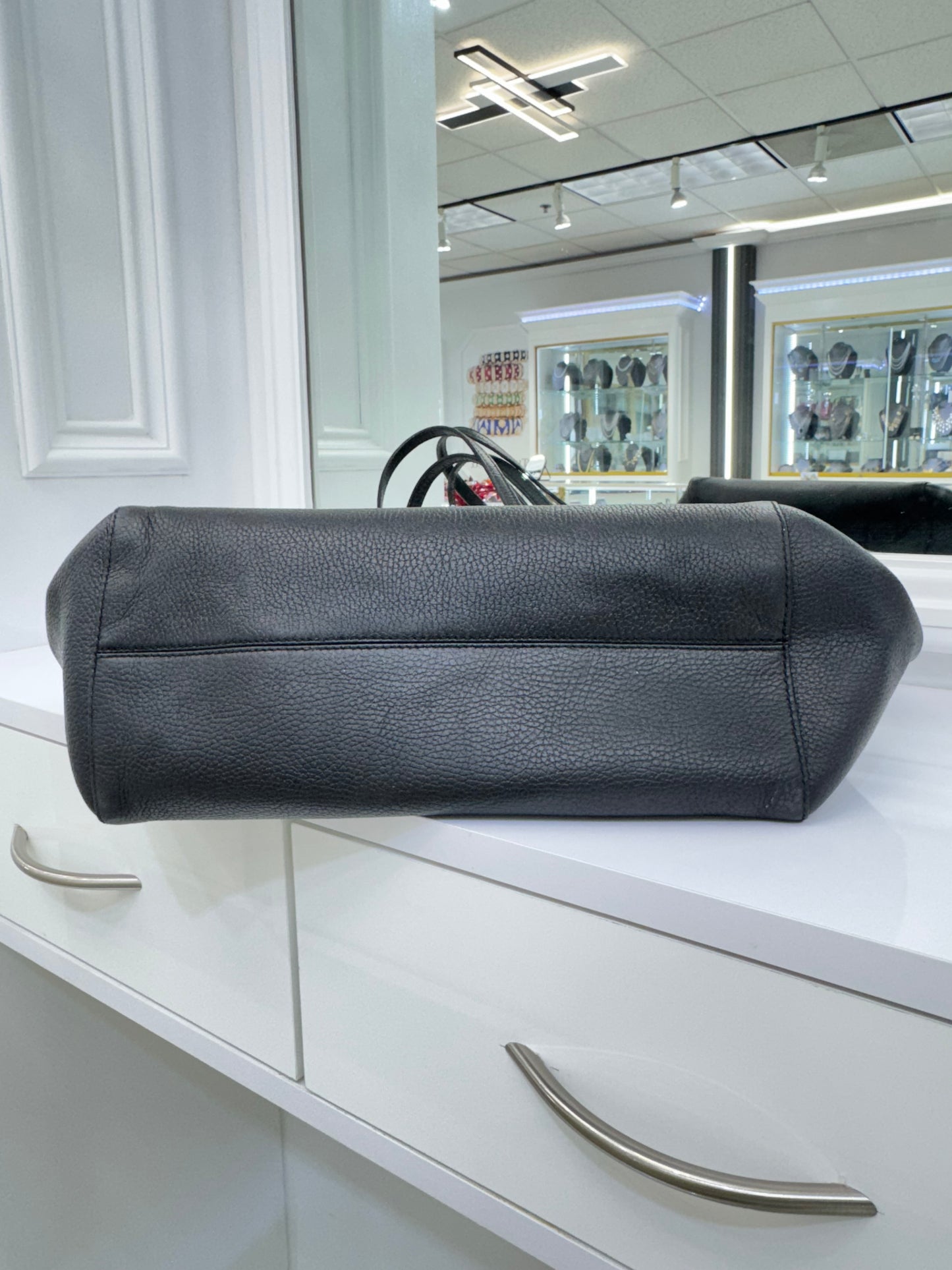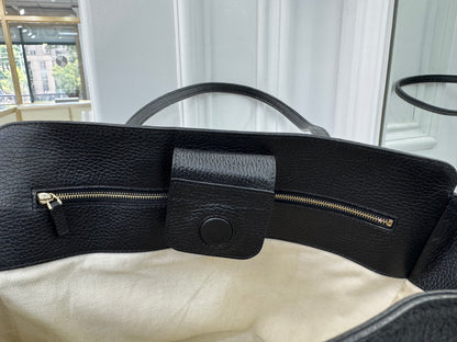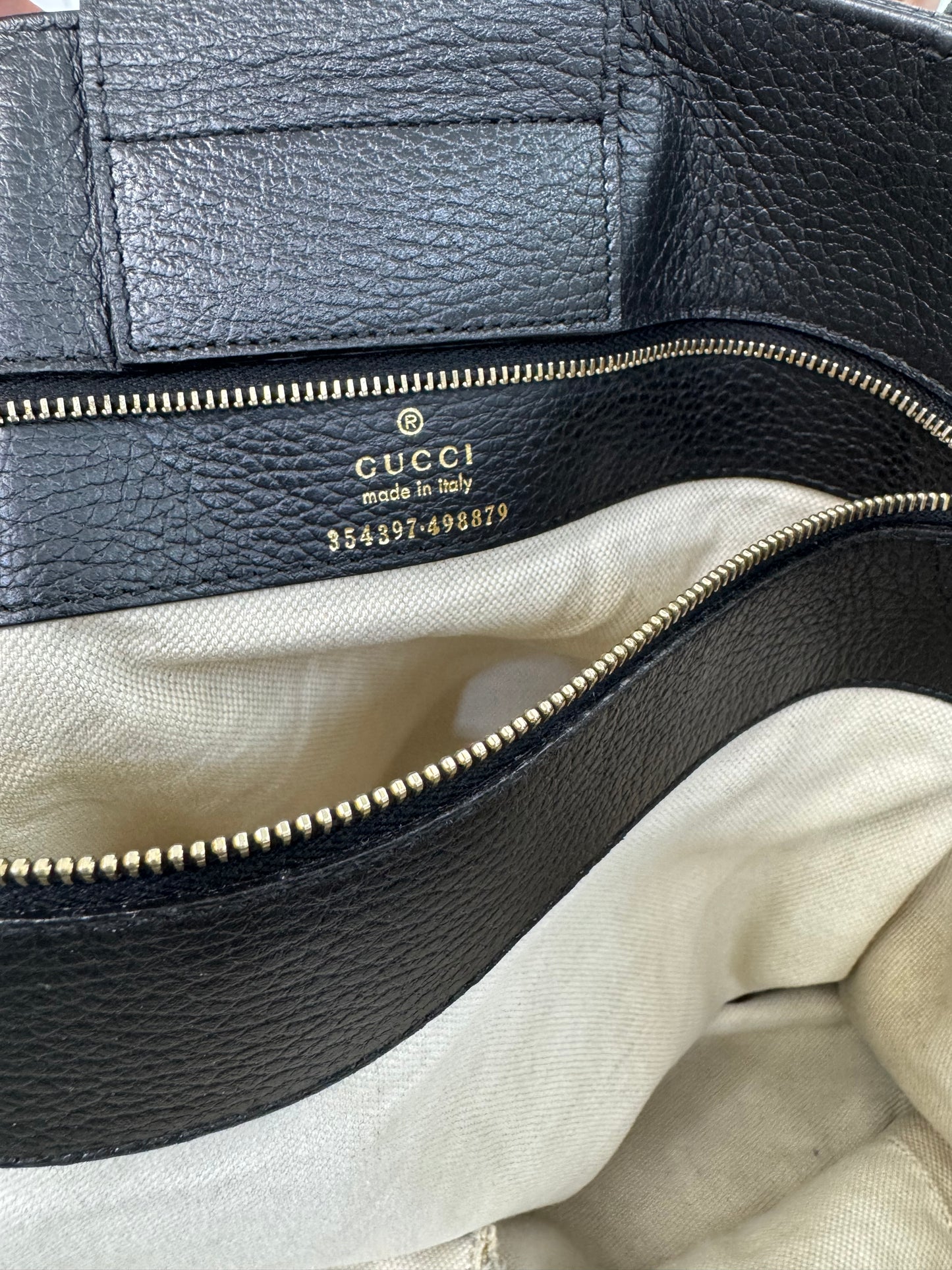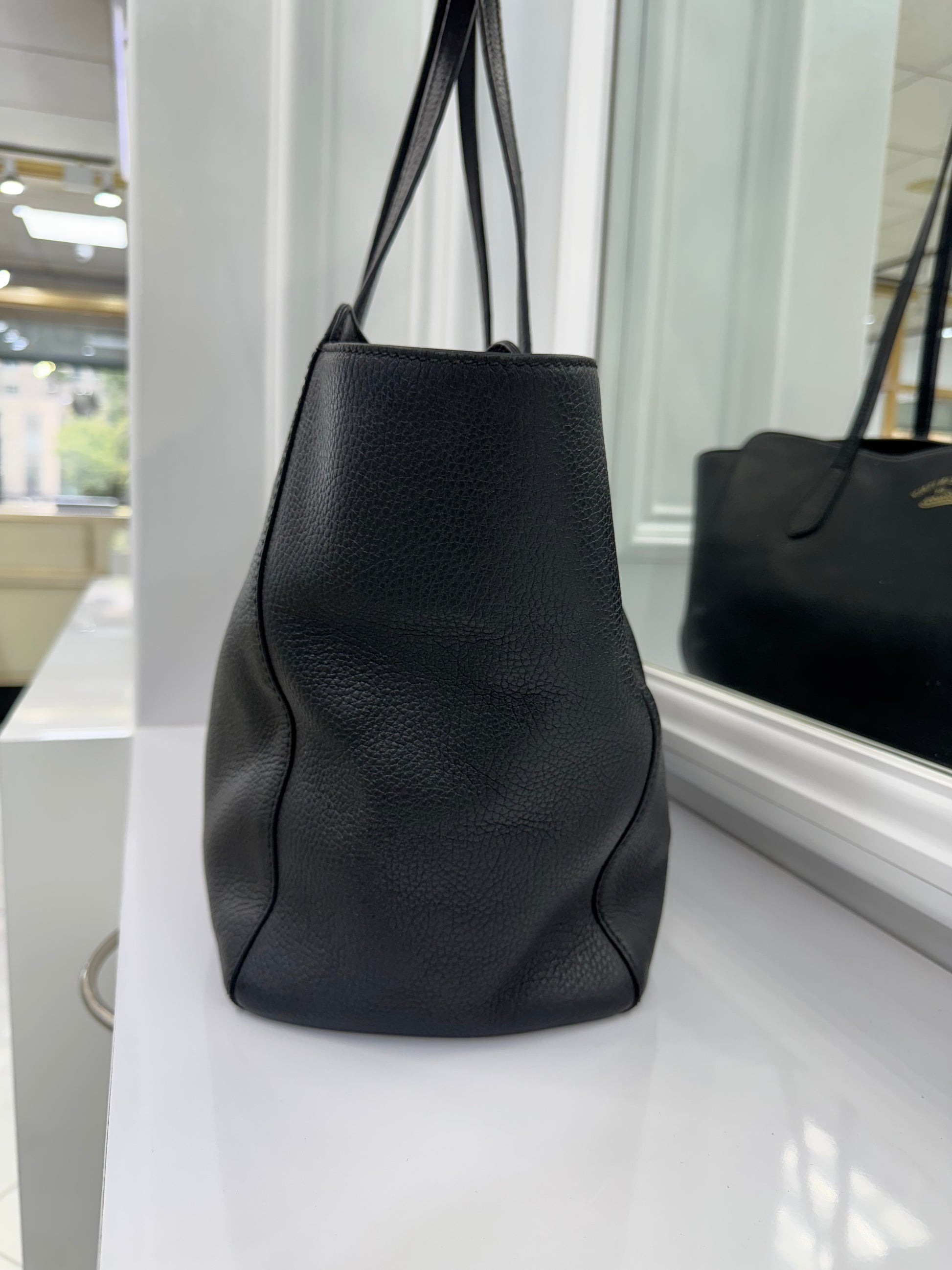Authentic Gucci Swing tote crafted in rich black grained leather. Made in Italy, this structured yet spacious tote features dual top handles, a soft beige canvas interior, and gold-tone embossed logo detailing that adds a subtle designer finish.