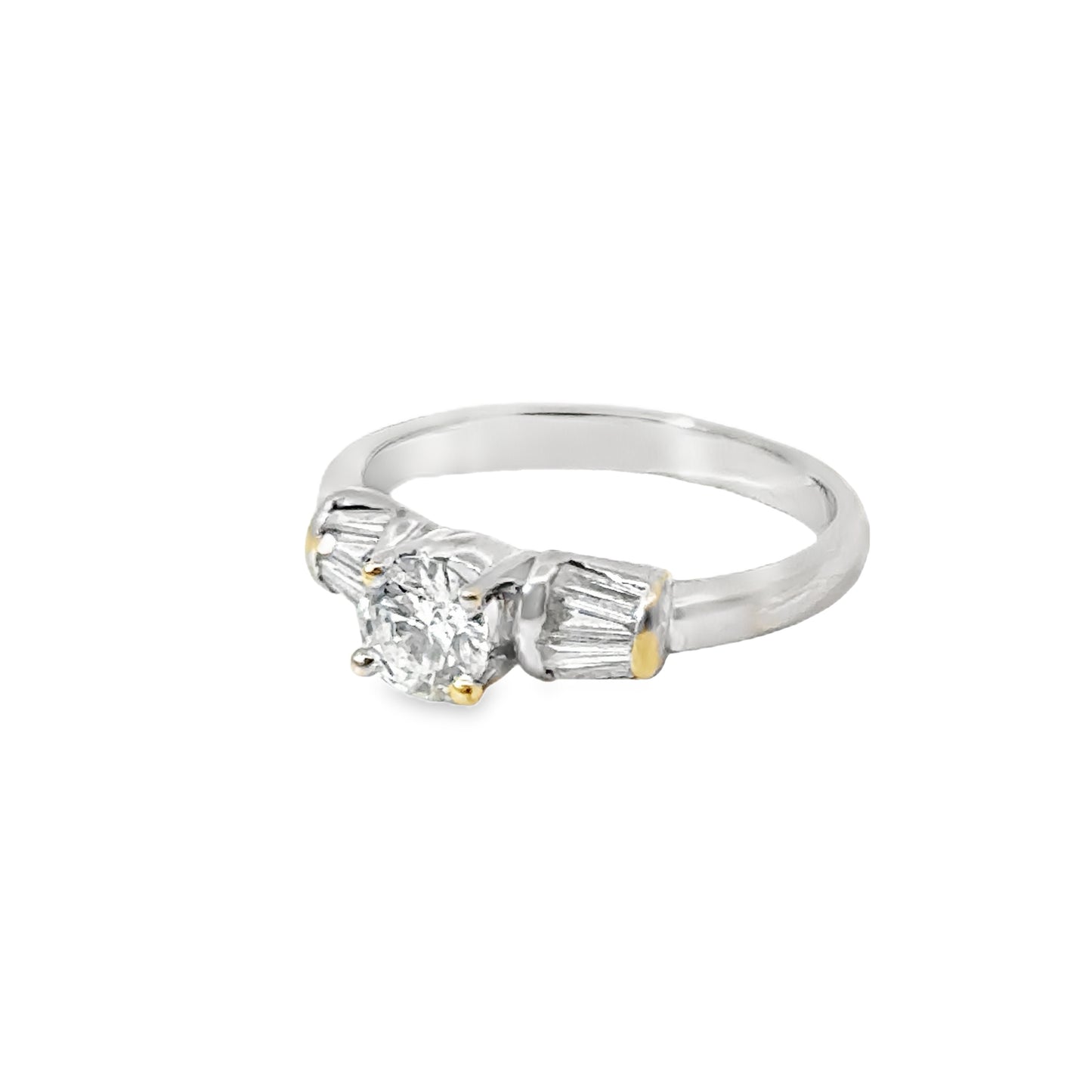 Lovely vintage platinum engagement ring that blends classic elegance with a modern twist. The centerpiece of the ring is a round brilliant-cut diamond, securely bezel-set, creating a smooth and polished look. Surrounding the center stone are baguette cut diamonds adding to the sparkle and sophistication of the design. The overall effect is a harmonious blend of vintage charm and contemporary style, making it a perfect choice for someone who appreciates the beauty of the past with the sleekness of modern design. This ring would be an exquisite symbol of love and commitment, cherished for generations to come.