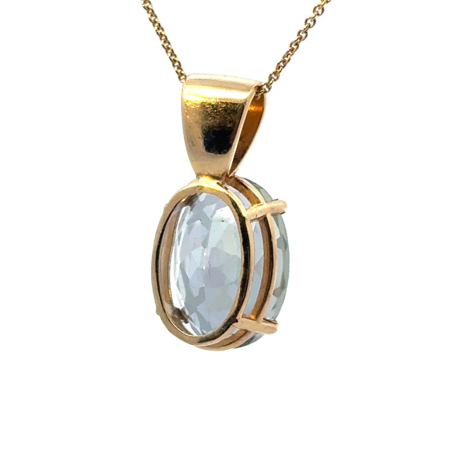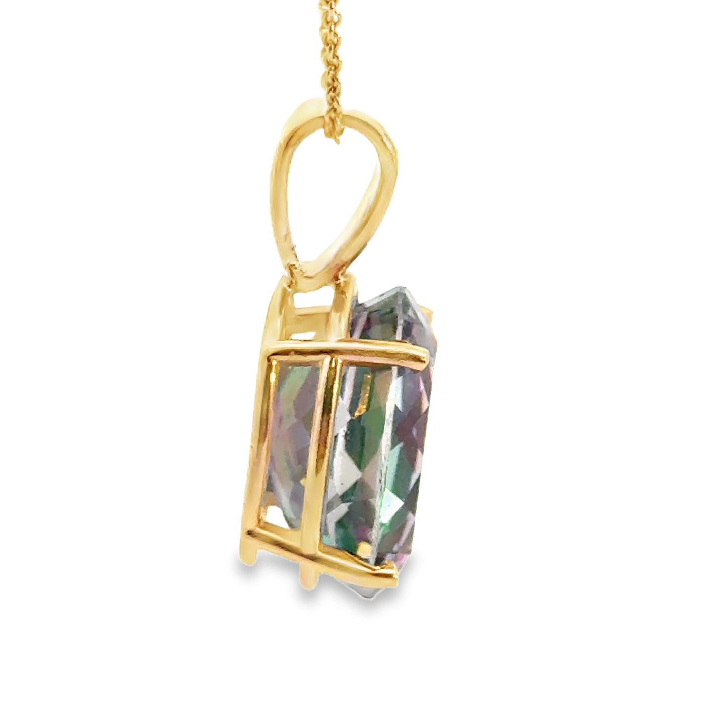 This elegant pendant is crafted from 14k yellow gold and features an eye-catching oval-cut gemstone secured by four prongs. The stone displays vibrant hues of green, blue, and purple, creating an iridescent, rainbow-like effect. The pendant is complemented by a polished, wide bail and an open gallery setting that allows light to enhance the gemstone’s brilliance, making it a striking, versatile piece for any occasion.
