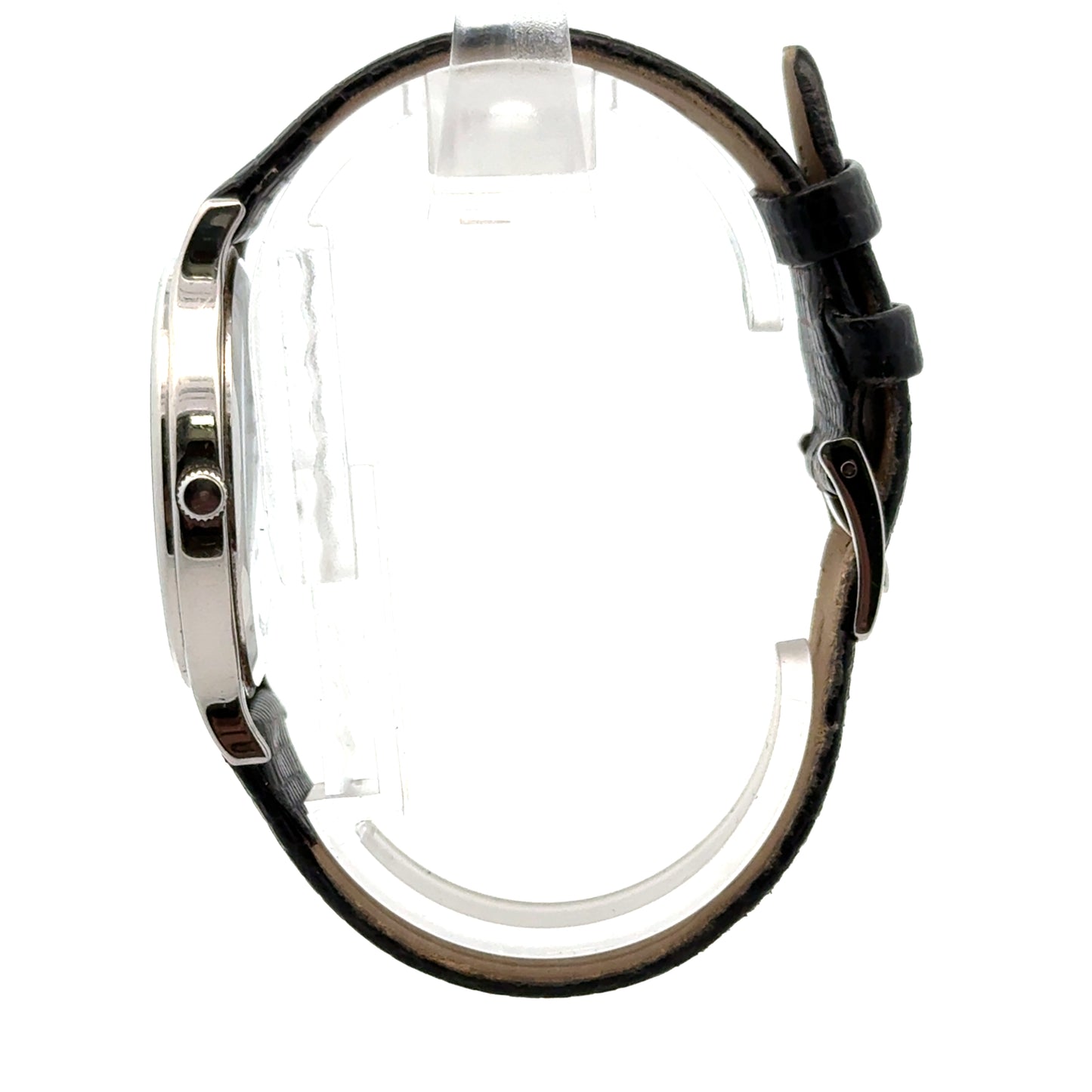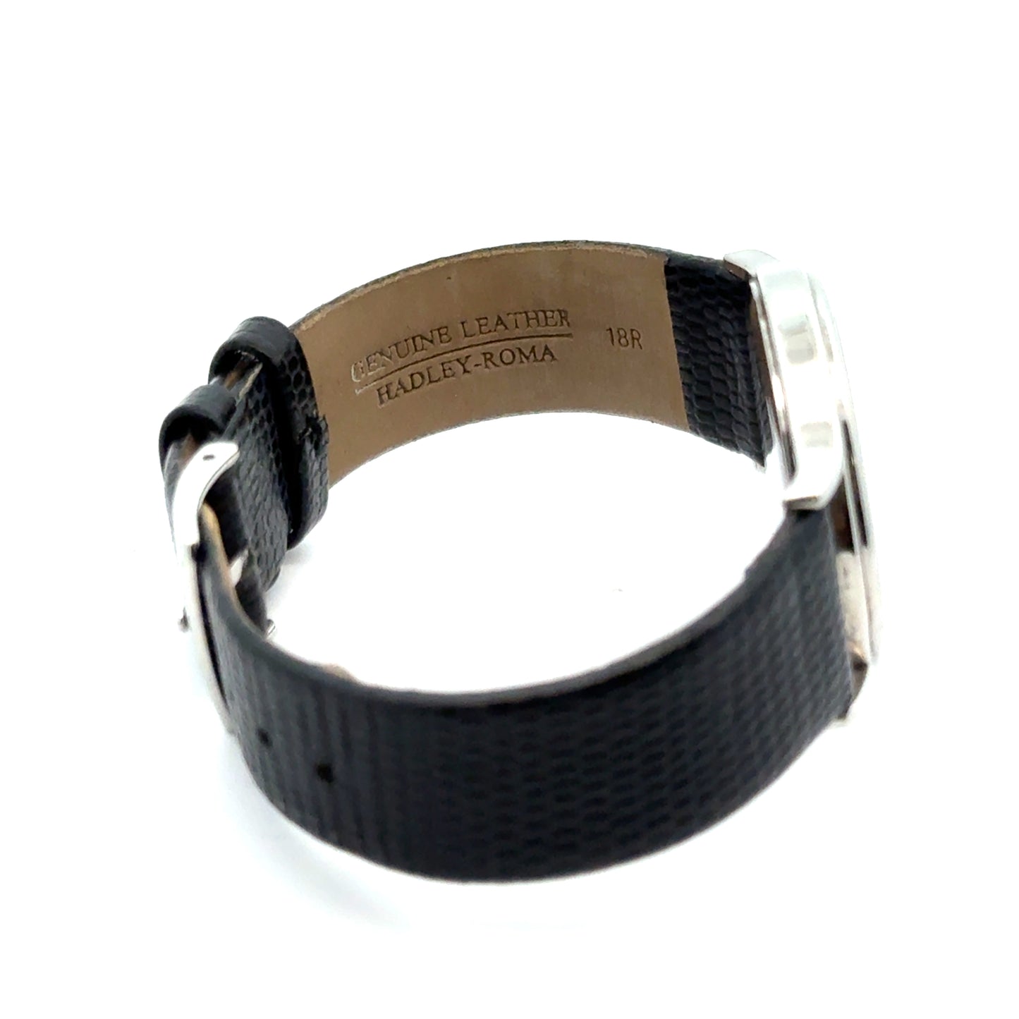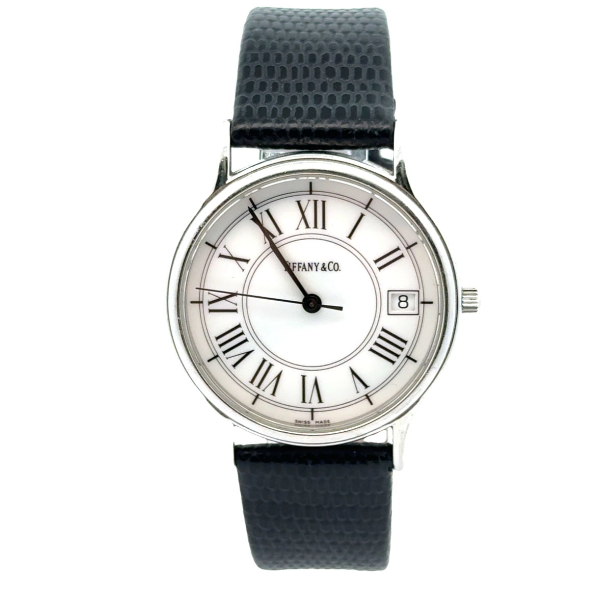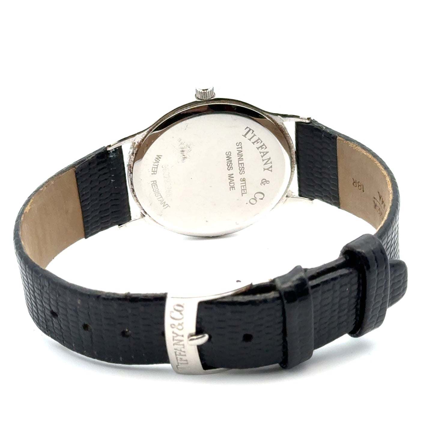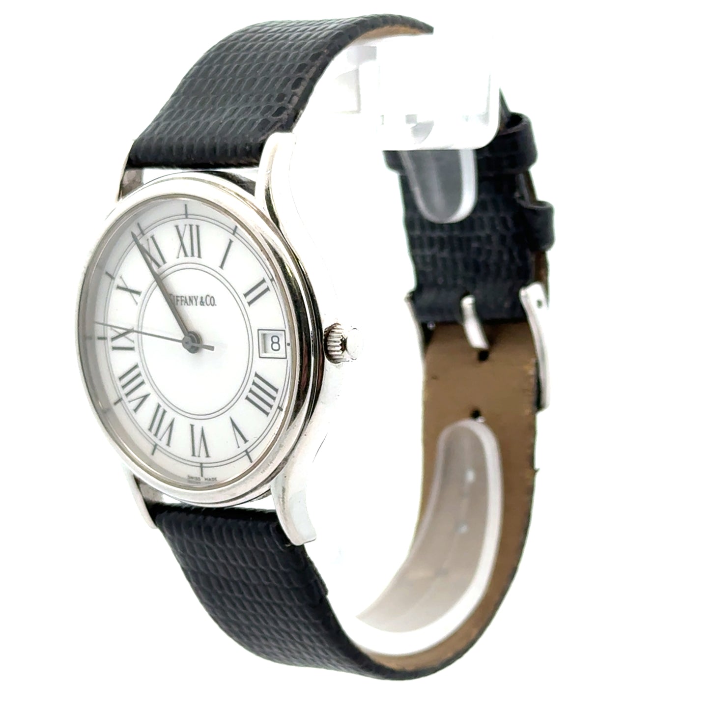 | Tiffany & Co. #960290988, Analog Display with Roman numerals, silver case color, date, black leather strap genuine leather by Hadley-Roma 18R, 33mm case, stainless steel, water resistant, quartz movement (battery operated), Swiss made |