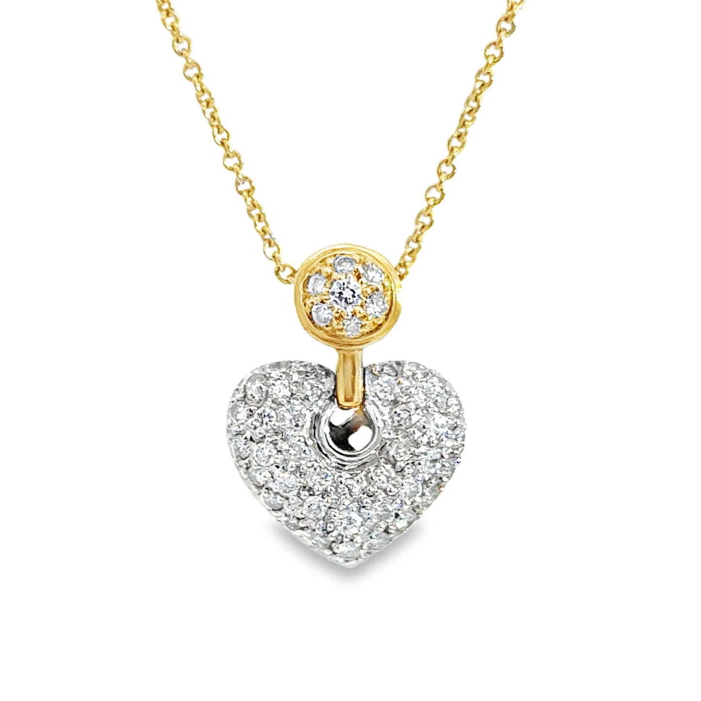 This pendant features a stunning heart-shaped design adorned with high-quality VS/G grade diamonds, offering exceptional brilliance and clarity. The front showcases a pave setting of diamonds, creating a dazzling, continuous sparkle. Above the heart is a round diamond cluster set in an 18k yellow gold bezel, enhancing the pendant’s luxurious appeal. The contrast between the white brilliance of the diamonds and the rich warmth of the yellow gold chain and bezel creates a timeless, elegant look.