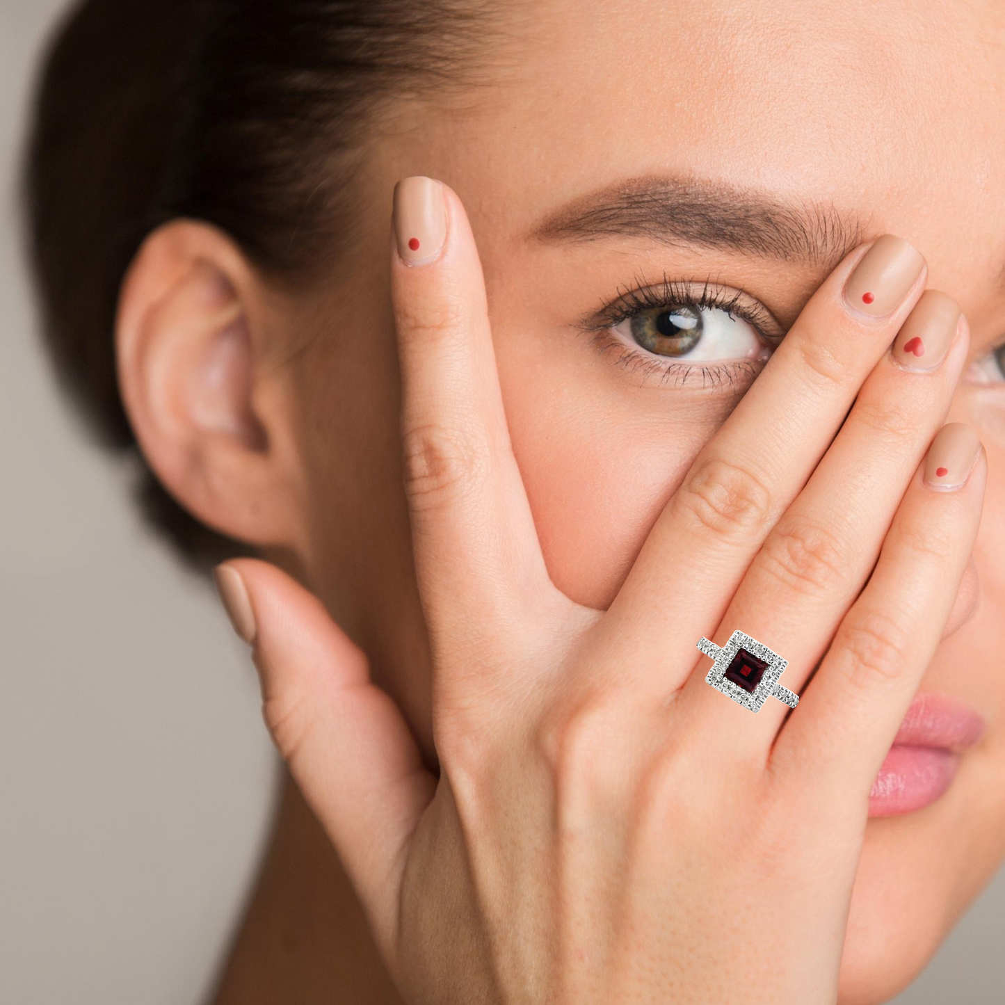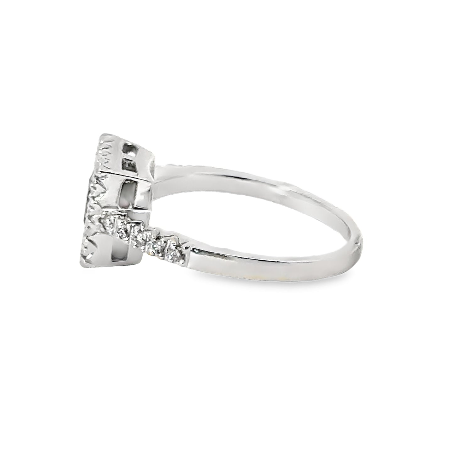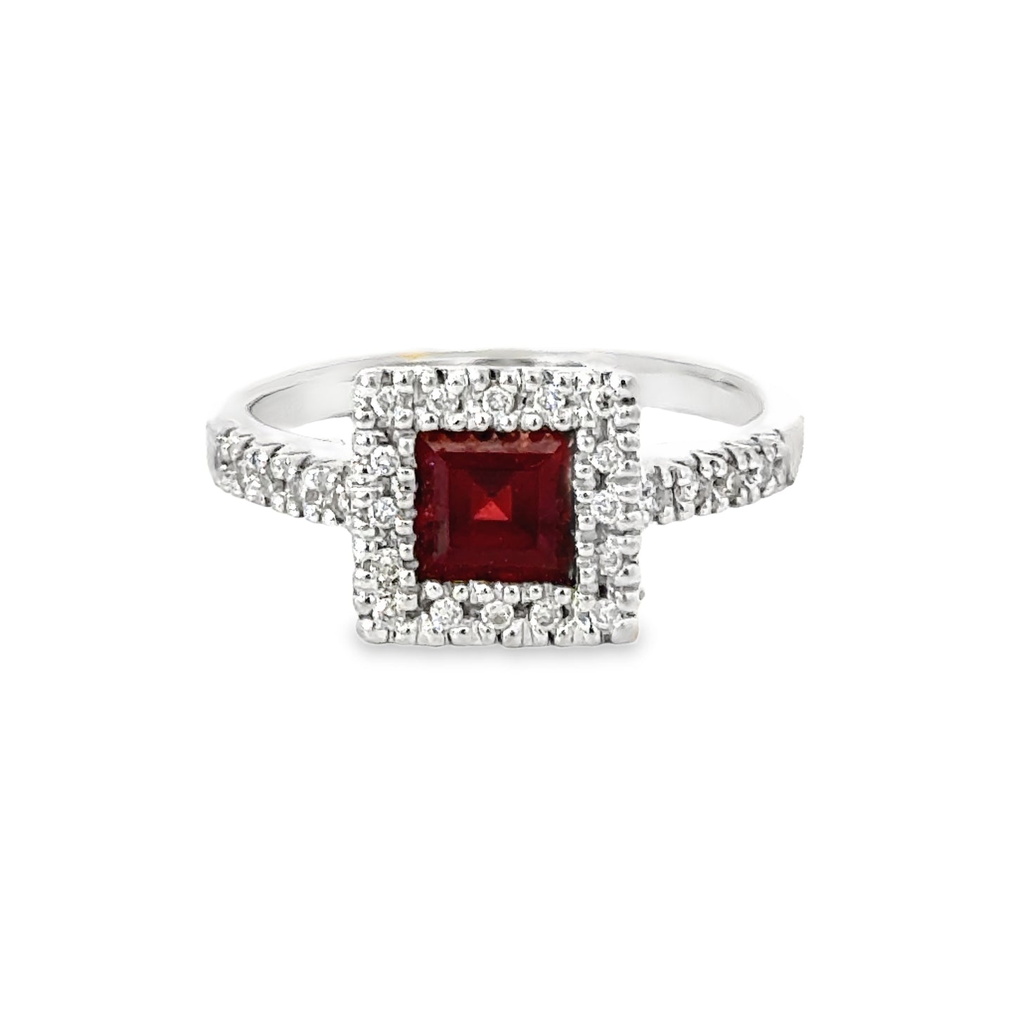 This elegant Gabriel & Co. 14k white gold ring showcases a striking square-cut ruby at its center, surrounded by a radiant halo of round-cut diamonds. The vivid red of the ruby contrasts beautifully with the brilliance of the diamonds and the cool sheen of the white gold band. The diamond-studded shoulders further enhance the ring’s refined and timeless design. Perfect for adding a touch of luxury and sophistication to any ensemble, this piece combines classic elegance with modern flair, making it an exceptional gift or a treasured addition to any jewelry collection.