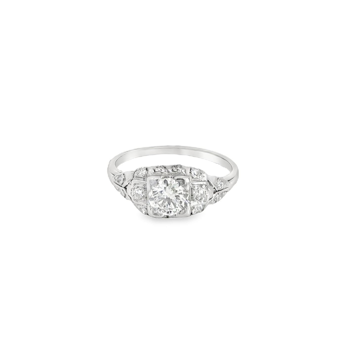 Antique platinum engagement ring showcases an exquisite center diamond, surrounded by a cluster of smaller diamonds that enhance its brilliance. The intricate detailing and craftsmanship are evident in the delicate milgrain and filigree work that adorn the setting, adding a touch of vintage elegance. The side diamonds, set in a symmetrical pattern, add to the ring’s overall sparkle, making it a truly stunning piece of jewelry. This ring is a timeless representation of beauty and sophistication, perfect for someone who appreciates the charm of antique designs.