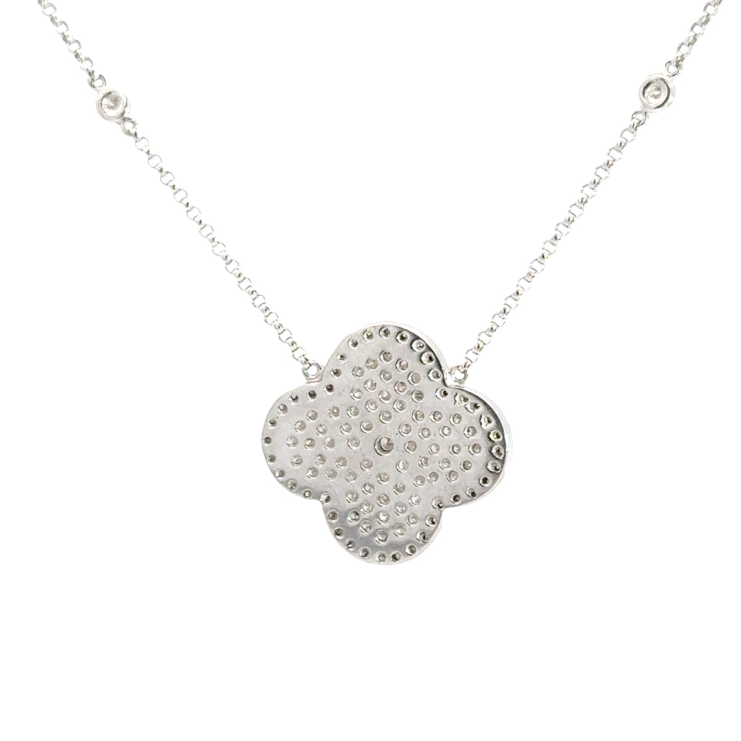 This charming and lovely diamond pendant showcases a beautifully designed floral clover pattern, encrusted with shimmering diamonds. The delicate chain adds to the elegance, making it a perfect choice for sophisticated and stylish individuals.