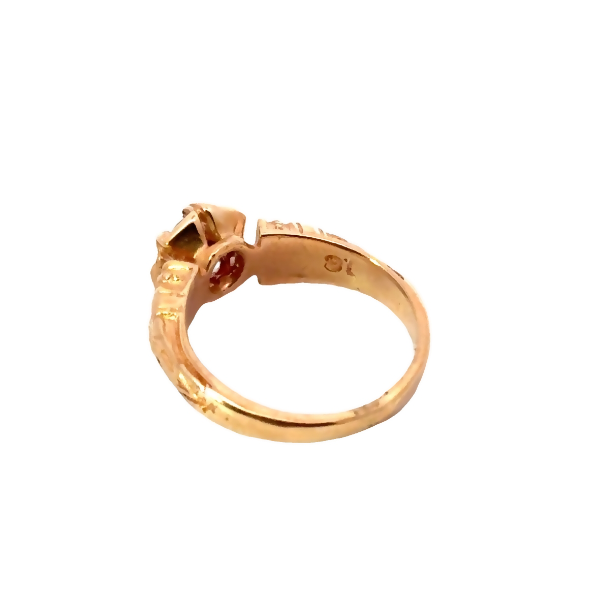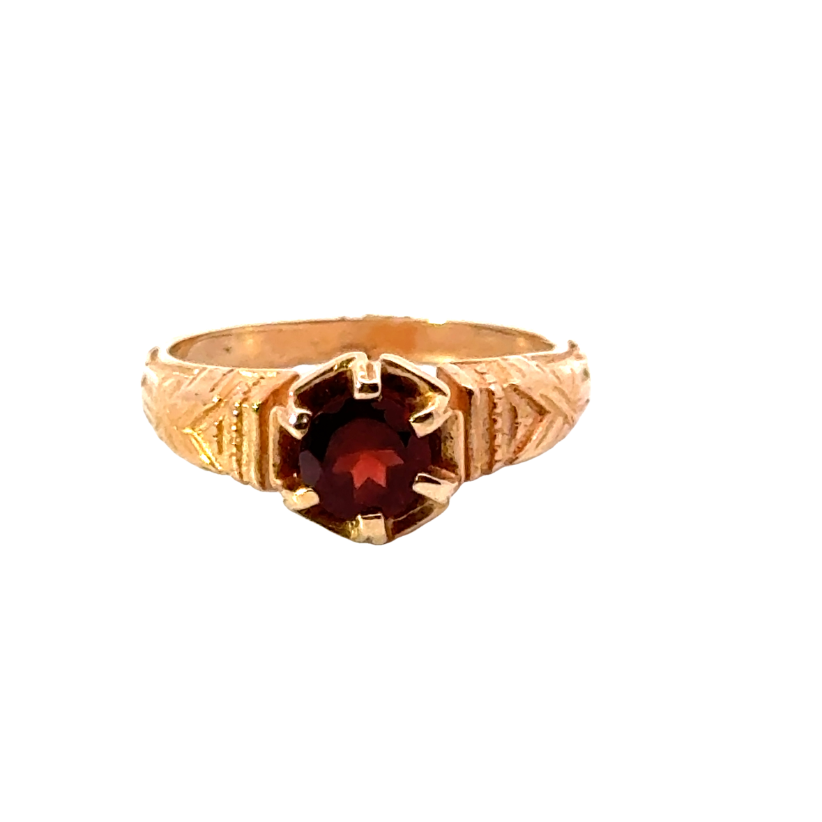 This vintage rose gold ring showcases a beautiful red garnet at its center. The garnet is securely held by six prongs, accentuating its round cut and fiery red hues. The band features intricate engravings, adding a touch of craftsmanship and charm. The engravings are delicate and detailed, with geometric patterns that enhance the vintage feel. The warm tones of the rose gold contrast beautifully with the deep red of the garnet, making this piece both timeless and elegant. Perfect for anyone with a love for vintage-inspired designs, this ring exudes an antique charm that would suit any occasion.